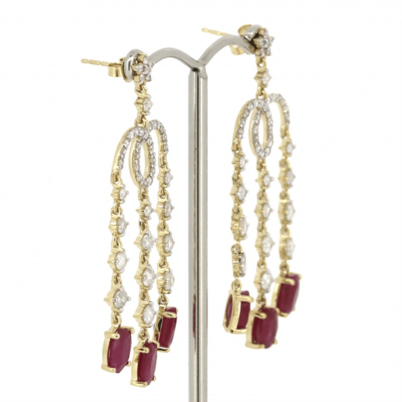 14K YELLOW GOLD, RUBY AND DIAMOND, CHANDELIER EARRINGS. THE DESIGN FEATURES, 6 OVAL CUT, MEDIUM-DARK PURPLISH-RED, RUBIES (6.29CT TSW, INCLUDED), CLAW SET. DECORATING THE DESIGN ARE, 84 ROUND BRILLIANT CUT, DIAMONDS (2.30CT TDW, J-K COLOUR, SI2-I2 CLARITY), CLAW/BEAD SET IN WHITE GOLD. THE EARRINGS HAVE POST BACKS, WITH 14K YELLOW GOLD BUTTERFLY CLASPS. Valuations Provided by an Independent Third-Party Professional Not Directly Associated With Lloyds Auctions at AUD $$19,790.00This valuation has been conducted by an independent third-party professional. The valuation amount is an assessment by the issuing valuer and does not reflect the auction value of the item. Any inquiries regarding the valuation should be directed to the issuing valuer (refer to contact details on the certificate), as Lloyds Auctions has no affiliation or influence over the valuation, the valuer, or the stated amount. Condition: Good - Refer Images 0645878+1510