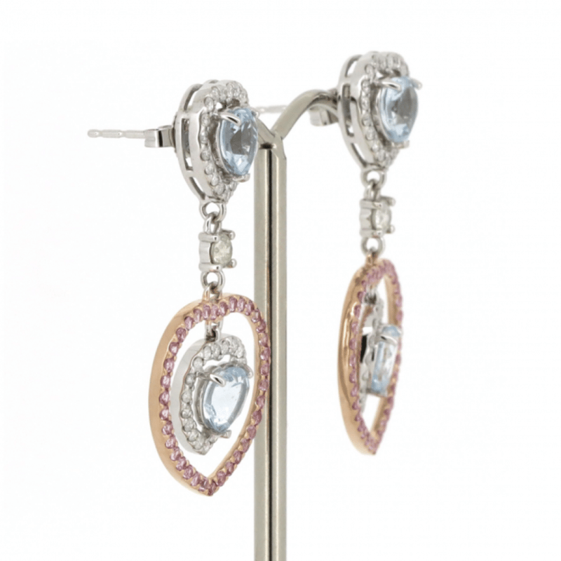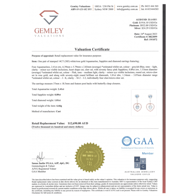 14K WHITE/ROSE GOLD, AQUAMARINE, PINK SAPPHIRE AND DIAMOND, HALO DROP EARRINGS. THE DESIGN FEATURES, 4 HEART SHAPE CUT, LIGHT GREYISH-BLUE, AQUAMARINES (2.41CT TSW, MINOR EYE VISIBLE INCLUSIONS), CLAW SET. DECORATING THE OUTERMOST HALO OF THE DROPS ARE, 70 ROUND CUT, MEDIUM-LIGHT PINK, SAPPHIRES (0.89CT TSW, MINOR EYE VISIBLE INCLUSIONS), MICRO-CLAW SET IN ROSE GOLD. ACCOMPANIED BY, 78 ROUND BRILLIANT CUT, DIAMONDS (1.01CT TDW, J-K COLOUR, SI2-I2 CLARITY), CLAW SET. THE EARRINGS HAVE POST BACKS, WITH 14K WHITE GOLD BUTTERFLY CLASPS. Valuations Provided by an Independent Third-Party Professional Not Directly Associated With Lloyds Auctions at AUD $$12,690.00This valuation has been conducted by an independent third-party professional. The valuation amount is an assessment by the issuing valuer and does not reflect the auction value of the item. Any inquiries regarding the valuation should be directed to the issuing valuer (refer to contact details on the certificate), as Lloyds Auctions has no affiliation or influence over the valuation, the valuer, or the stated amount. Condition: Good - Refer Images 0645878+1595