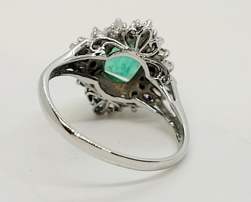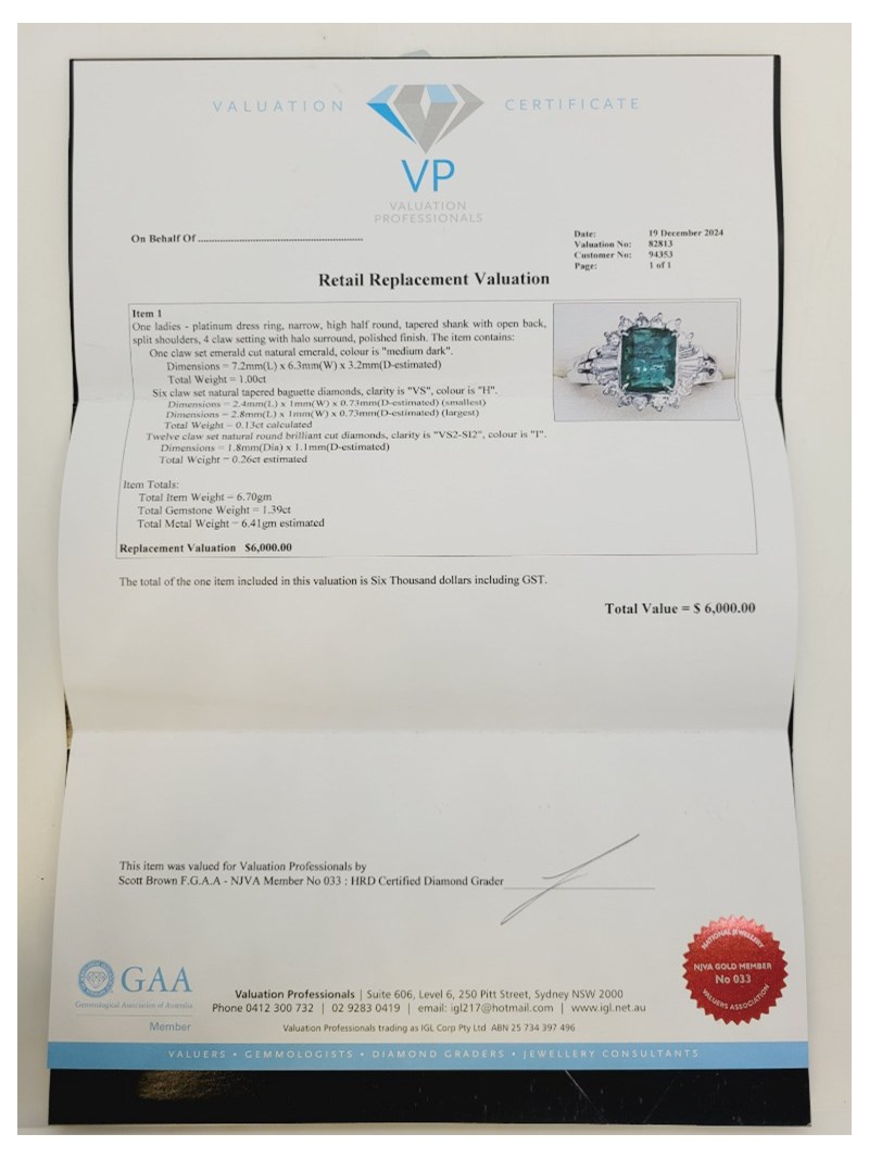 1.39CT EMERALD AND DIAMOND RING Item Totals - Total Item Weight: 6.70G Total Gemstone Weight: 1.39Ct Total Metal Weight: 6.41G Condition: Excellent - Refer To Images Provenance: Platinum Dress Ring, Narrow, High Half Round, Tapered Shank With Open Back, Split Shoulders, 4 Claw Setting With Halo Surround, Polished Finish. This valuation has been conducted by an independent third-party professional. The valuation amount is an assessment by the issuing valuer and does not reflect the auction value of the item. Any inquiries regarding the valuation should be directed to the issuing valuer (refer to contact details on the certificate), as Lloyds Auctions has no affiliation or influence over the valuation, the valuer, or the stated amount. Insurance Replacement Valuation Amount: $6,000.00 160466+38