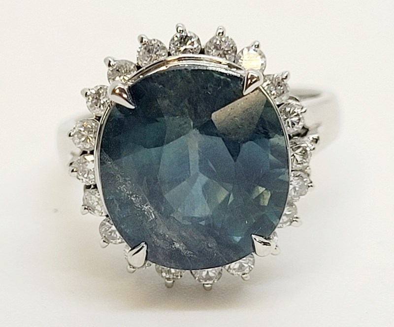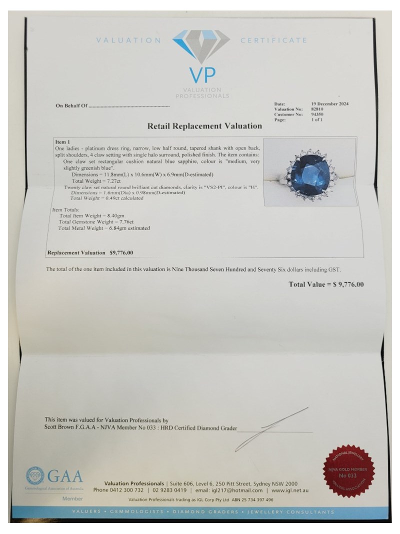 7.76CT BLUE SAPPHIRE AND DIAMOND RINGItem Totals - Total Items Weight: 8.40GTotal Gemstone Weight: 7.76CtTotal Metal Weight: 6.84G (Estimated)Condition: Excellent - Refer To ImagesProvenance: Platinum Dress Ring , Narrow, Low Half Round, Tapered Shank With Open Back, Split Shoulders, 4 Claw Setting With Single Halo Surround, Polished Finish.This valuation has been conducted by an independent third-party professional. The valuation amount is an assessment by the issuing valuer and does not reflect the auction value of the item.Any inquiries regarding the valuation should be directed to the issuing valuer (refer to contact details on the certificate), as Lloyds Auctions has no affiliation or influence over the valuation, the valuer, or the stated amount.Insurance Replacement Valuation Amount: $9,776.00160466+45