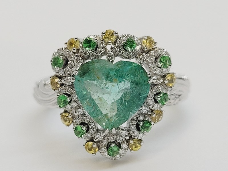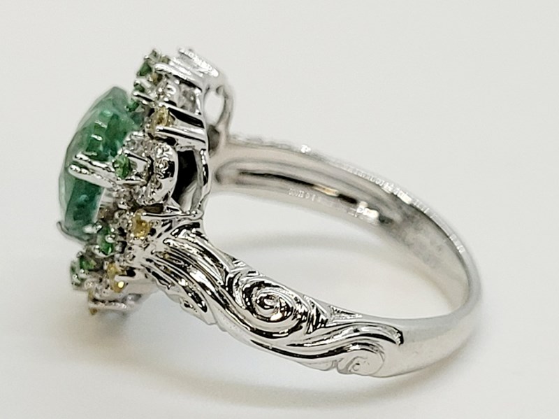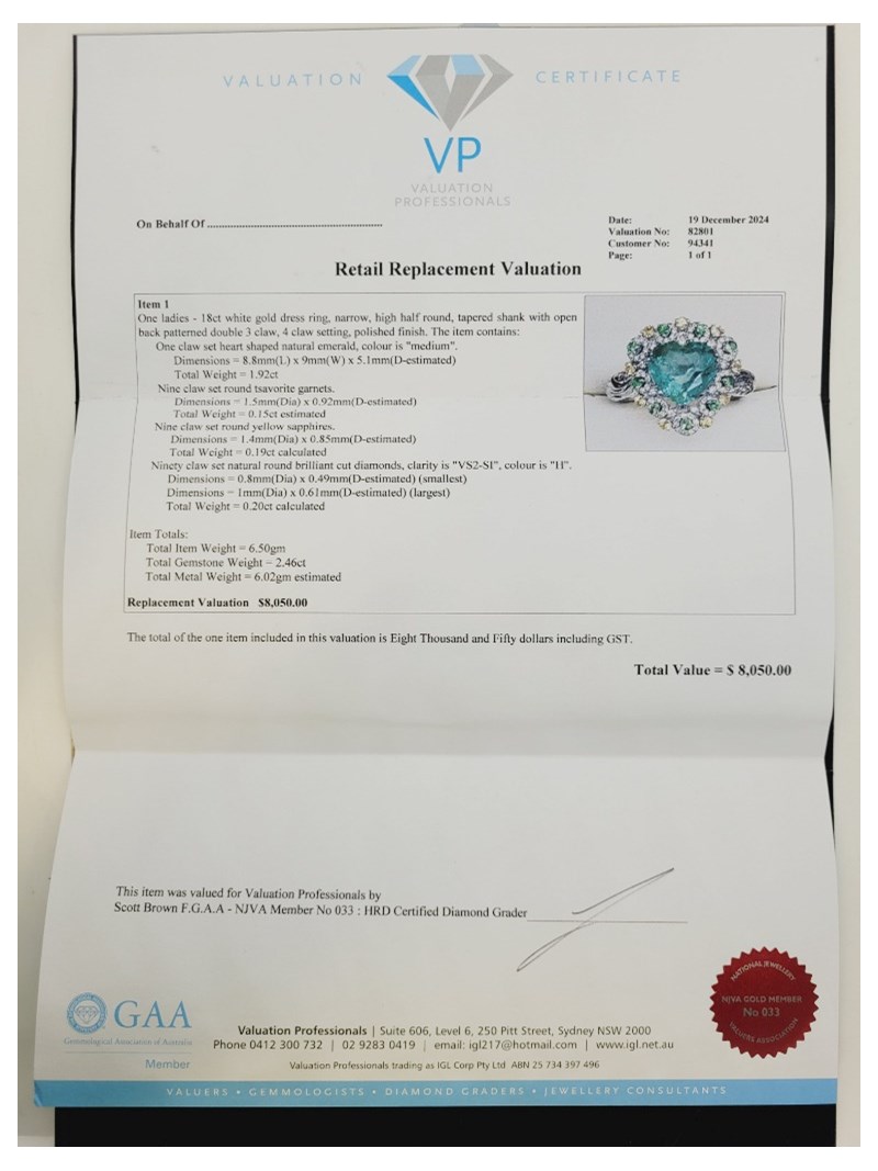 18CT WHITE GOLD EMERALD AND DIAMOND RINGItem Totals -Total Item Weight: 6.50GTotal Gemstone Weight: 2.46CtTotal Metal Weight: 6.02G (Estimated)Condition : Excellent - Refer To ImagesProvenance: 18Ct White Gold Dress Ring, Narrow, High Half Round, Tapered Shank With Open Back Patterned Double 3 Claw, 4 Claw Setting, Polished Finish.This valuation has been conducted by an independent third-party professional. The valuation amount is an assessment by the issuing valuer and does not reflect the auction value of the item.Any inquiries regarding the valuation should be directed to the issuing valuer (refer to contact details on the certificate), as Lloyds Auctions has no affiliation or influence over the valuation, the valuer, or the stated amount.Insurance Replacement Valuation Amount: $8,050.00160466+48