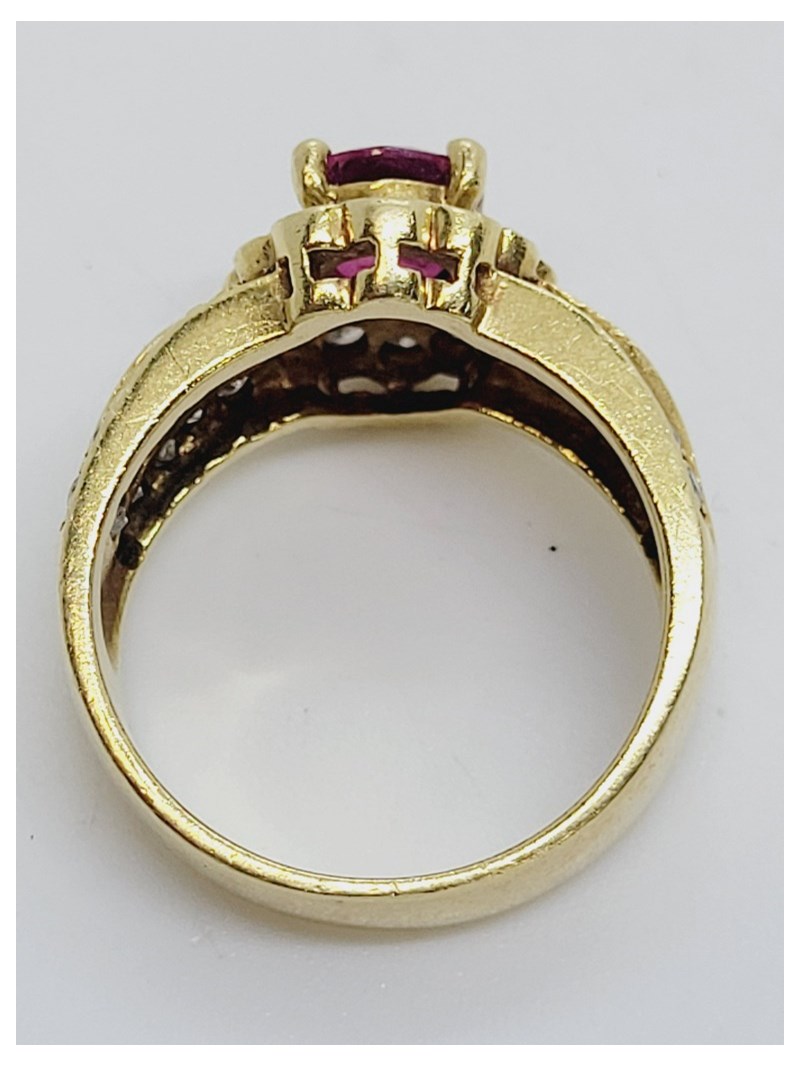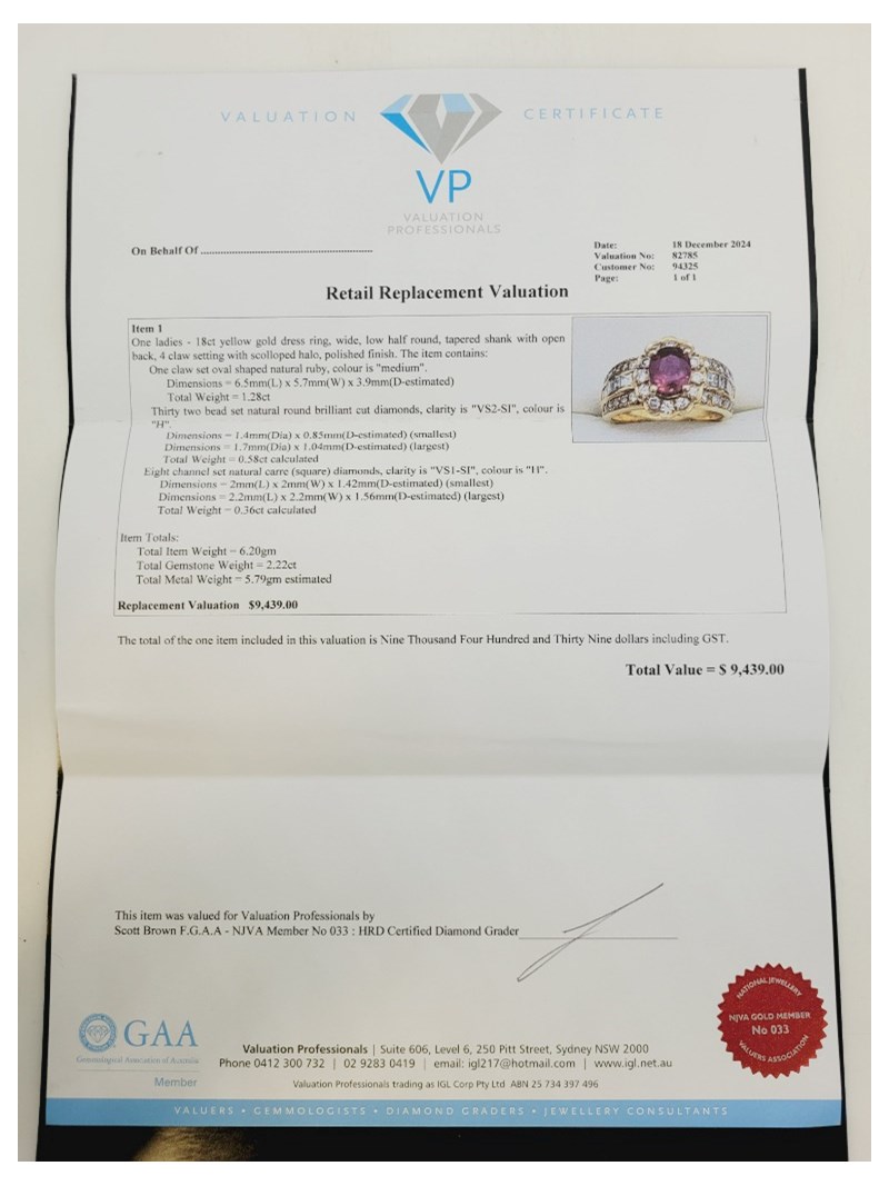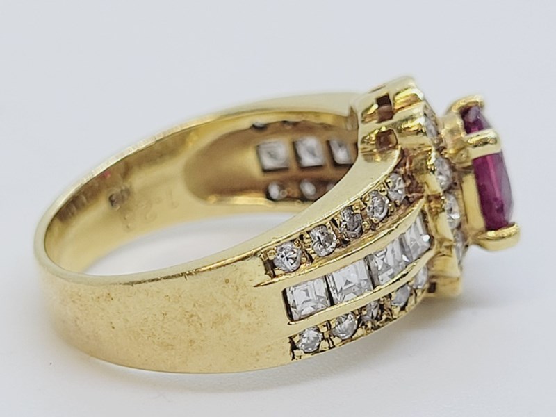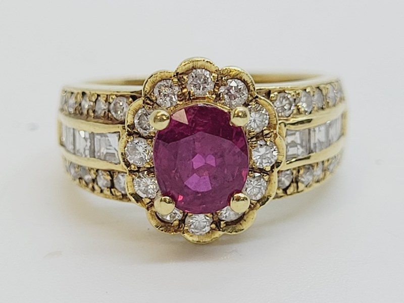 18CT YELLOW GOLD RUBY AND DIAMOND RINGItem Totals - Total Item Weight: 6.20GTotal Gemstone Weight:2.22CtTotal Metal Weight: 5.79GCondition: Excellent - Refer To ImagesProvenance: 18Ct Yellow Gold Dress Ring, Wide, Low Half Round, Tapered Shank With Open Back, 4 Claw Setting With Scolloped Halo , Polished FinishThis valuation has been conducted by an independent third-party professional. The valuation amount is an assessment by the issuing valuer and does not reflect the auction value of the item.Any inquiries regarding the valuation should be directed to the issuing valuer (refer to contact details on the certificate), as Lloyds Auctions has no affiliation or influence over the valuation, the valuer, or the stated amount.Insurance Replacement Valuation Amount: $9,439.00160466+36