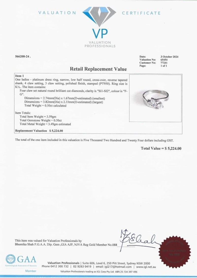 PLATINUM DRESS RING - Platinum Dress Ring, Narrow, Low Half Round, Cross-Over, Reverse Tapered Shank, 4 Claw Setting, 3 Claw Setting, Polished Finish, Stamped (Pt950). Ring Size Is K½.. The Item Contains: Four Claw Set Natural Round Brilliant Cut Diamonds, Clarity Is "Si1-Si2", Colour Is "F-G". Dimensions = 2.74Mm(Dia) X 1.67Mm(D-Estimated) (Smallest) Dimensions = 3.82Mm(Dia) X 2.33Mm(D-Estimated) (Largest) Total Weight = 0.50Ct Calculated Item Totals: Total Item Weight = 3.59Gm Total Gemstone Weight = 0.50Ct Total Metal Weight = 3.49Gm Estimated Valuations Provided by an Independent Third-Party Professional Not Directly Associated With Lloyds Auctions at AUD $5224 This valuation has been conducted by an independent third-party professional. The valuation amount is an assessment by the issuing valuer and does not reflect the auction value of the item. Any inquiries regarding the valuation should be directed to the issuing valuer (refer to contact details on the certificate), as Lloyds Auctions has no affiliation or influence over the valuation, the valuer, or the stated amount. Condition: Good - Refer Images 0 160781+40