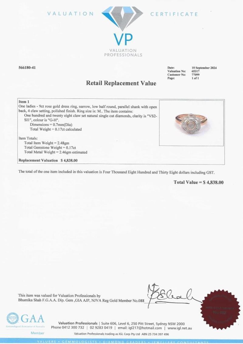 9CT ROSE GOLD DRESS RING - 9Ct Rose Gold Dress Ring, Narrow, Low Half Round, Parallel Shank With Open Back, 4 Claw Setting, Polished Finish. Ring Size Is: M.. The Item Contains: One Hundred And Twenty Eight Claw Set Natural Single Cut Diamonds, Clarity Is "Vs2-Si1", Colour Is "G-H". Dimensions = 0.7Mm(Dia) Total Weight = 0.17Ct Calculated Item Totals: Total Item Weight = 2.48Gm Total Gemstone Weight = 0.17Ct Total Metal Weight = 2.46Gm Estimated Valuations Provided by an Independent Third-Party Professional Not Directly Associated With Lloyds Auctions at AUD $4838 This valuation has been conducted by an independent third-party professional. The valuation amount is an assessment by the issuing valuer and does not reflect the auction value of the item. Any inquiries regarding the valuation should be directed to the issuing valuer (refer to contact details on the certificate), as Lloyds Auctions has no affiliation or influence over the valuation, the valuer, or the stated amount. Condition: Good - Refer Images 0 160781+44