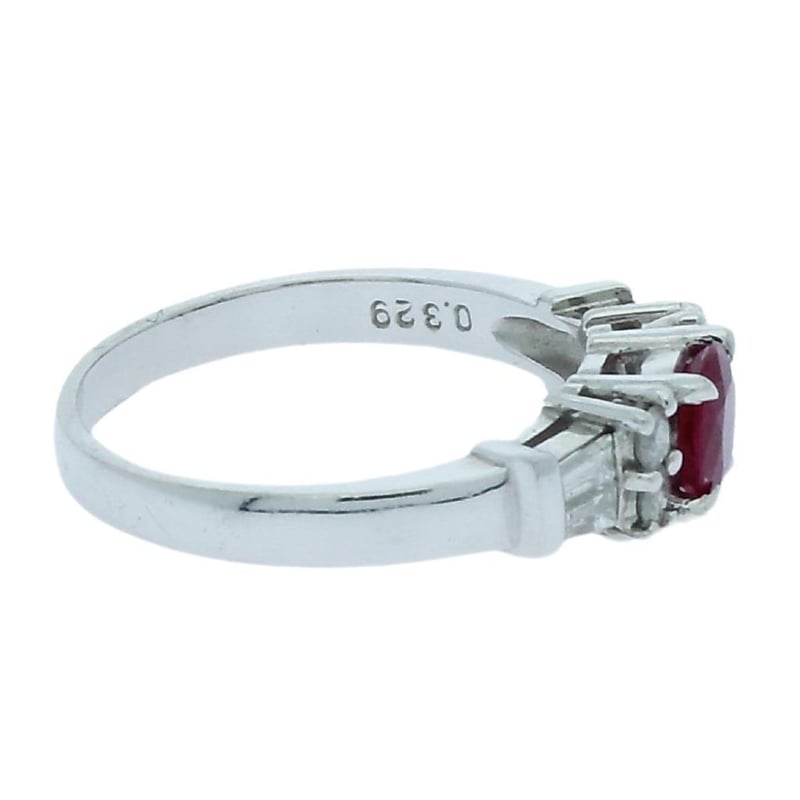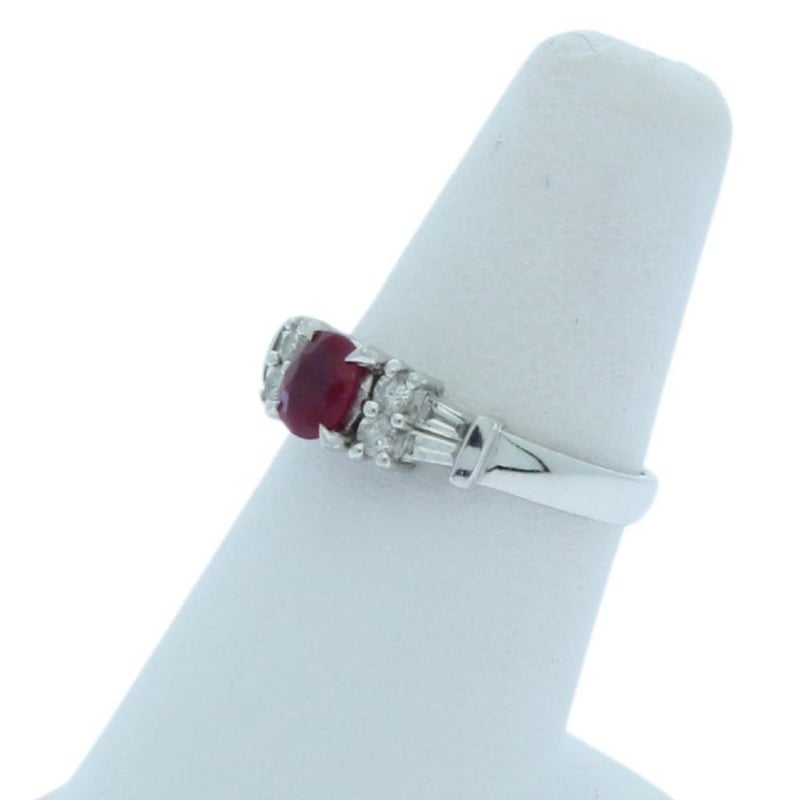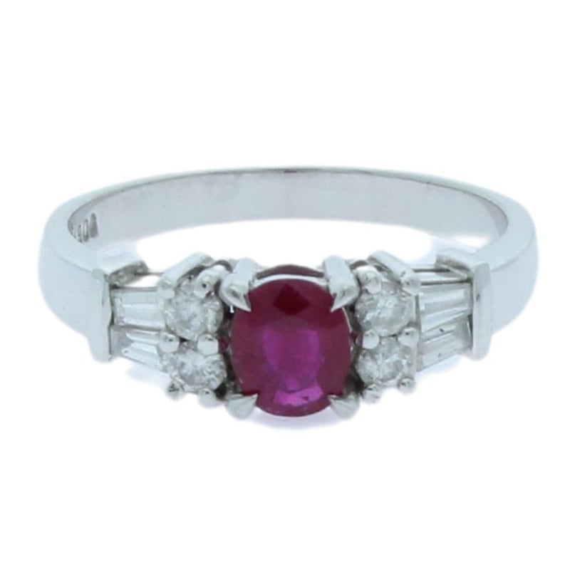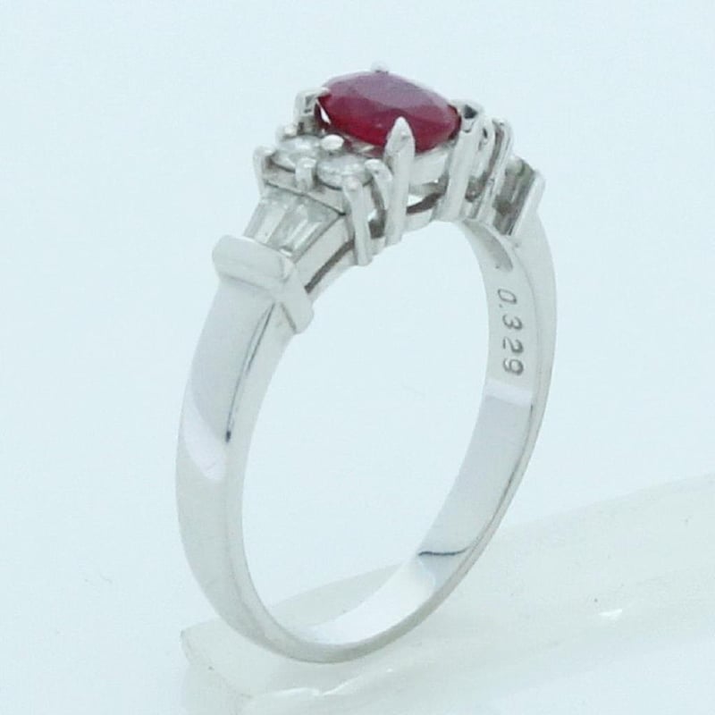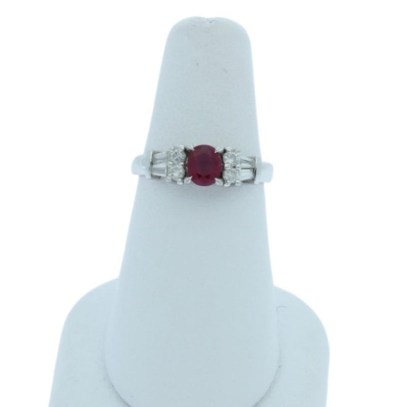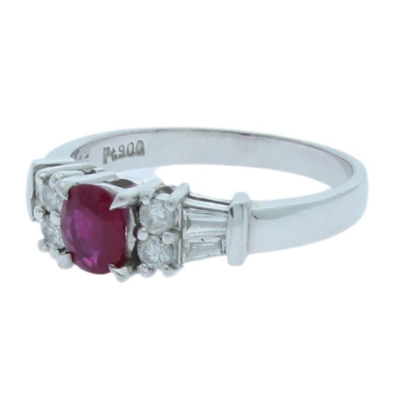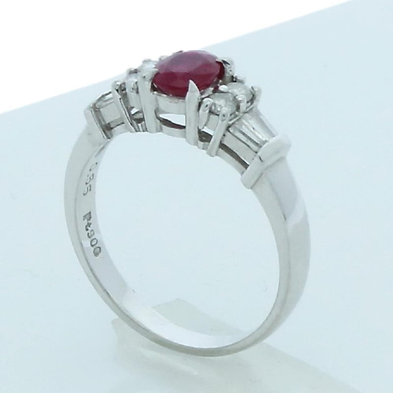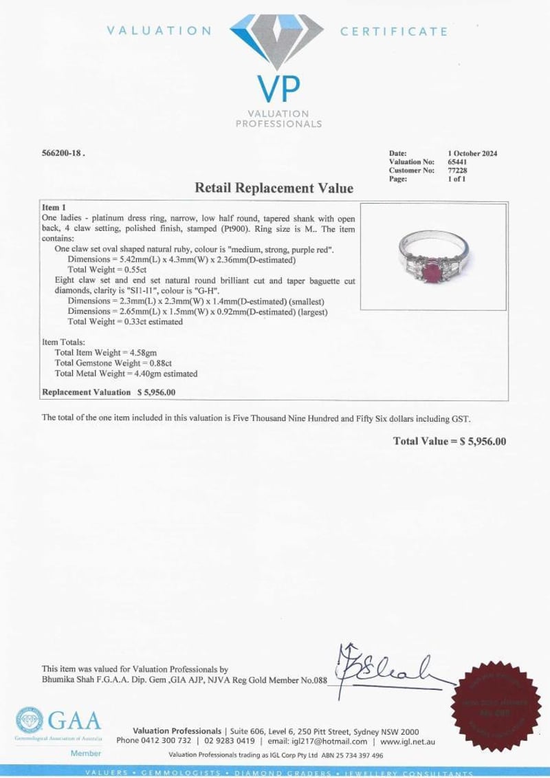 PLATINUM DRESS RING - Platinum Dress Ring, Narrow, Low Half Round, Tapered Shank With Open Back, 4 Claw Setting, Polished Finish, Stamped (Pt900). Ring Size Is M.. The Item Contains: One Claw Set Oval Shaped Natural Ruby, Colour Is "Medium, Strong, Purple Red". Dimensions = 5.42Mm(L) X 4.3Mm(W) X 2.36Mm(D-Estimated) Total Weight = 0.55Ct Eight Claw Set And End Set Natural Round Brilliant Cut And Taper Baguette Cut Diamonds, Clarity Is "Si1-I1", Colour Is "G-H". Dimensions = 2.3Mm(L) X 2.3Mm(W) X 1.4Mm(D-Estimated) (Smallest) Dimensions = 2.65Mm(L) X 1.5Mm(W) X 0.92Mm(D-Estimated) (Largest) Total Weight = 0.33Ct Estimated Item Totals: Total Item Weight = 4.58Gm Total Gemstone Weight = 0.88Ct Total Metal Weight = 4.40Gm Estimated Valuations Provided by an Independent Third-Party Professional Not Directly Associated With Lloyds Auctions at AUD $5956 This valuation has been conducted by an independent third-party professional. The valuation amount is an assessment by the issuing valuer and does not reflect the auction value of the item. Any inquiries regarding the valuation should be directed to the issuing valuer (refer to contact details on the certificate), as Lloyds Auctions has no affiliation or influence over the valuation, the valuer, or the stated amount. Condition: Good - Refer Images 0 160781+23