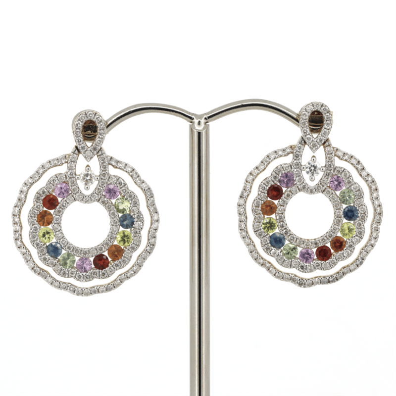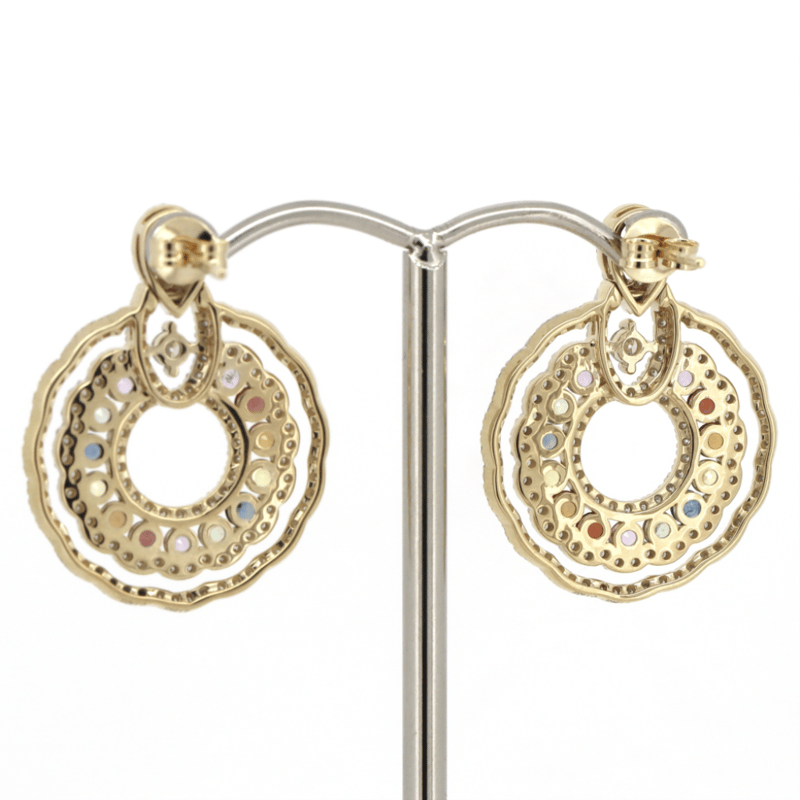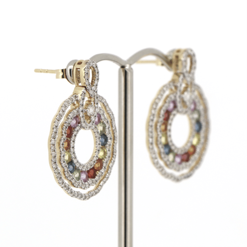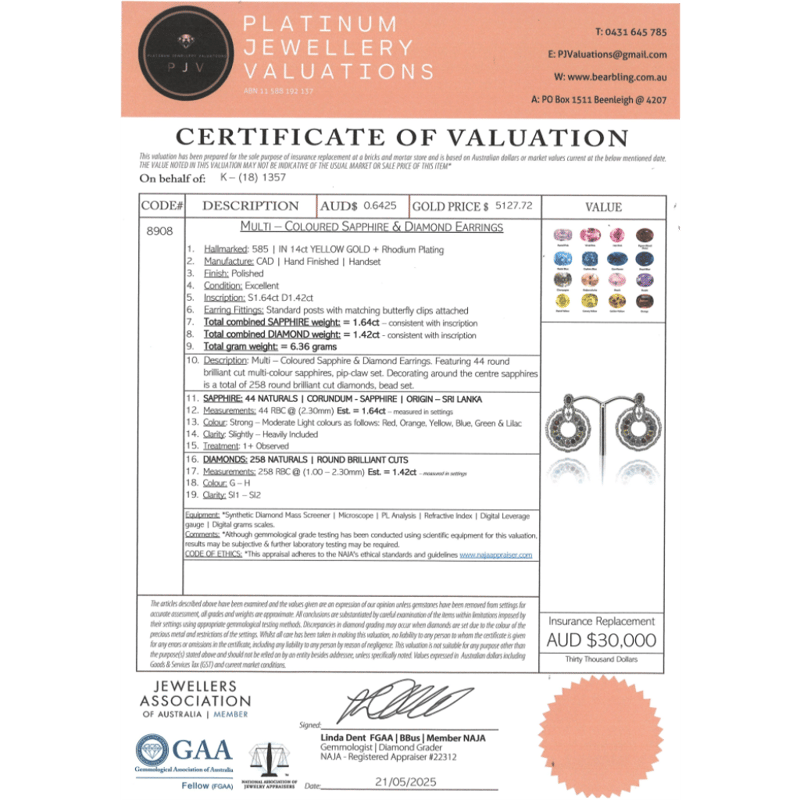 14K YELLOW GOLD, MULTI-COLOURED SAPPHIRE AND DIAMOND, EARRINGS. THE DESIGN FEATURES, 44 ROUND BRILLIANT CUT, RED, ORANGE, YELLOW, BLUE, GREEN AND LILAC COLOURS, SAPPHIRES (1.64CT TSW, SLIGHTLY-HEAVILY INCLUDED, TREATMENTS OBSERVED), PIP-CLAW SET. ENCOMPASSING THE DESIGN ARE, 258 ROUND BRILLIANT CUT, DIAMONDS (1.42CT TDW, G-H COLOUR, SI1-SI2 CLARITY), BEAD SET. THE EARRINGS HAVE 14K YELLOW GOLD POSTS WITH MATCHING BUTTERFLY CLASPS. Valuations Provided by an Independent Third-Party Professional Not Directly Associated With Lloyds Auctions at AUD $30000This valuation has been conducted by an independent third-party professional. The valuation amount is an assessment by the issuing valuer and does not reflect the auction value of the item. Any inquiries regarding the valuation should be directed to the issuing valuer (refer to contact details on the certificate), as Lloyds Auctions has no affiliation or influence over the valuation, the valuer, or the stated amount. Condition: Good - Refer Images 0645860+86