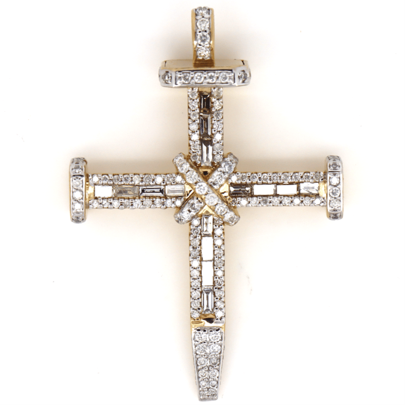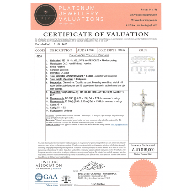 14K YELLOW/WHITE GOLD AND DIAMOND, CRUCIFIX PENDANT. THE DESIGN FEATURES, 145 ROUND BRILLIANT CUT, DIAMONDS (0.20CT TDW, G-H COLOUR, SI1 - SI2 CLARITY), AND 15 BAGUETTE CUT, DIAMONDS (1.388CT TDW, G-H COLOUR, SI1-SI2 CLARITY), CHANNEL/PIP CLAW SET. Valuations Provided by an Independent Third-Party Professional Not Directly Associated With Lloyds Auctions at AUD $19000This valuation has been conducted by an independent third-party professional. The valuation amount is an assessment by the issuing valuer and does not reflect the auction value of the item. Any inquiries regarding the valuation should be directed to the issuing valuer (refer to contact details on the certificate), as Lloyds Auctions has no affiliation or influence over the valuation, the valuer, or the stated amount. Condition: Good - Refer Images 0645860+94