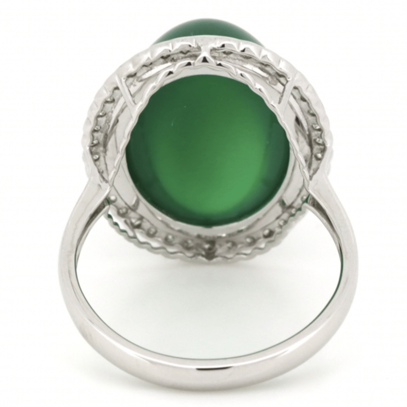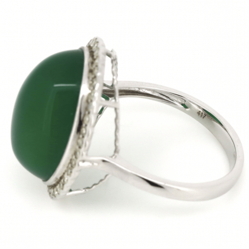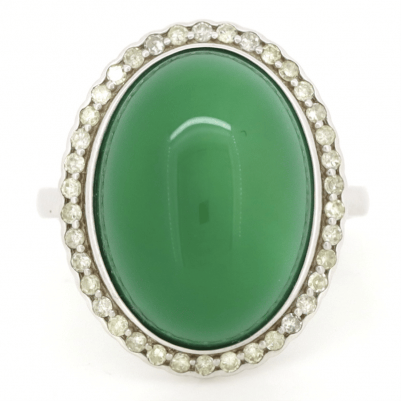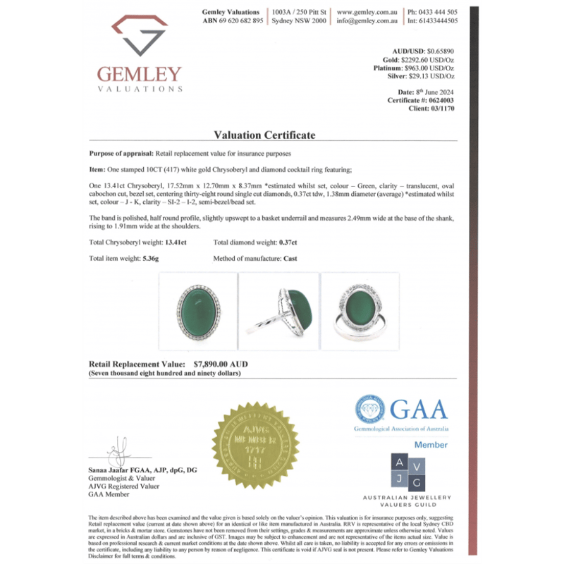 10K WHITE GOLD, 13.41CT GREEN CHRYSOBERYL AND DIAMOND, STATEMENT RING. THE CENTRE FEATURES, ONE OVAL CABOCHON CUT, GREEN, CHRYSOBERYL (13.41CT, TRANSLUCENT), BEZEL SET. SURROUNDING THE CENTRE IN A HALO ARE, 38 ROUND SINGLE CUT, DIAMONDS (0.37CT TDW, J-K COLOUR, SI2-I2 CLARITY), SEMI-BEZEL/BEAD SET. RING SIZE O 1/2. Valuations Provided by an Independent Third-Party Professional Not Directly Associated With Lloyds Auctions at AUD $7890This valuation has been conducted by an independent third-party professional. The valuation amount is an assessment by the issuing valuer and does not reflect the auction value of the item. Any inquiries regarding the valuation should be directed to the issuing valuer (refer to contact details on the certificate), as Lloyds Auctions has no affiliation or influence over the valuation, the valuer, or the stated amount. Condition: Good - Refer Images 0645860+51