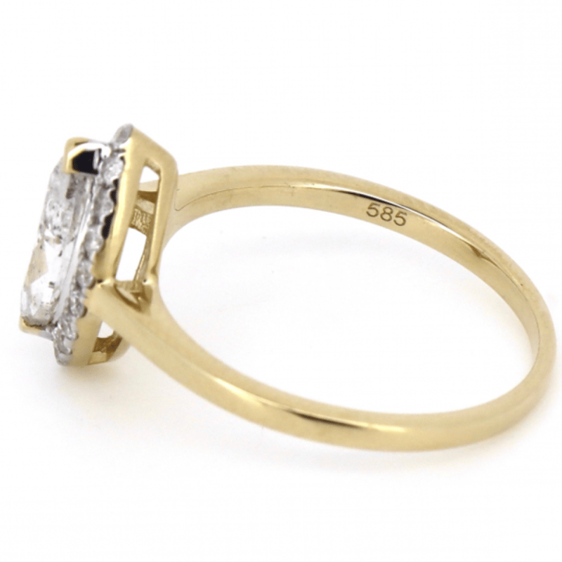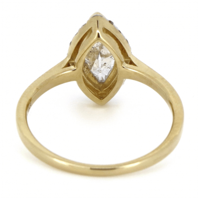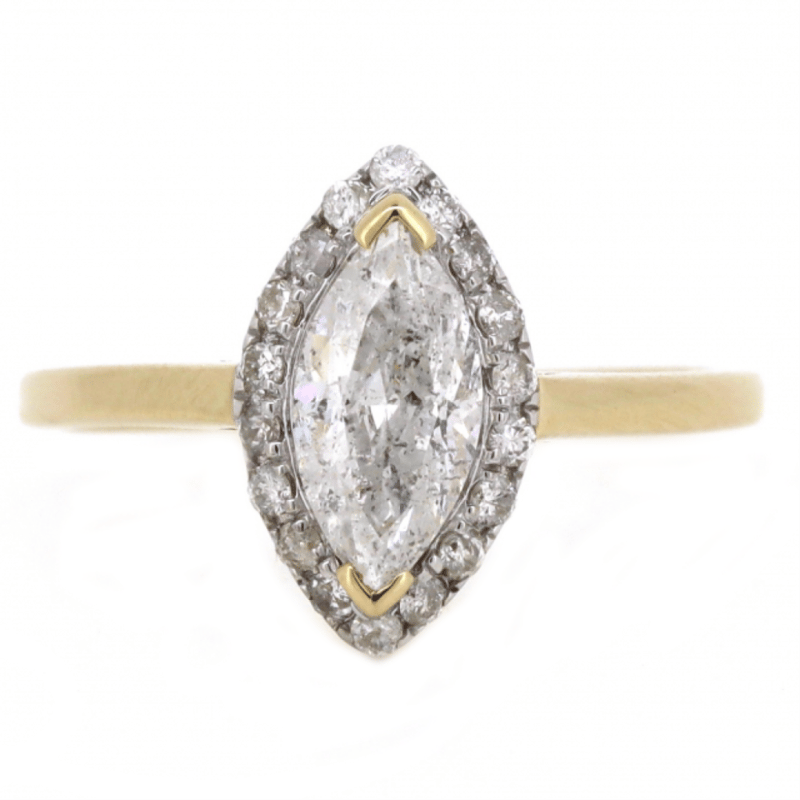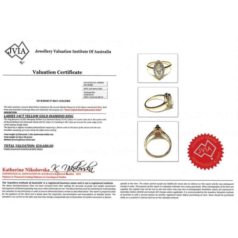 14K YELLOW GOLD AND DIAMOND, HALO RING. THE CENTRE FEATURES, ONE MARQUISE CUT, DIAMOND (0.92CT, H-I COLOUR, P2-P3 CLARITY), CORNER CLAW SET. SURROUNDING THE CENTRE IN A HALO ARE, 18 ROUND BRILLIANT CUT, DIAMONDS (0.18CT TDW, H-J COLOUR, SI2-P2 CLARITY), CLAW SET. RING SIZE L 1/2. Valuations Provided by an Independent Third-Party Professional Not Directly Associated With Lloyds Auctions at AUD $20680This valuation has been conducted by an independent third-party professional. The valuation amount is an assessment by the issuing valuer and does not reflect the auction value of the item. Any inquiries regarding the valuation should be directed to the issuing valuer (refer to contact details on the certificate), as Lloyds Auctions has no affiliation or influence over the valuation, the valuer, or the stated amount. Condition: Good - Refer Images 0645860+12