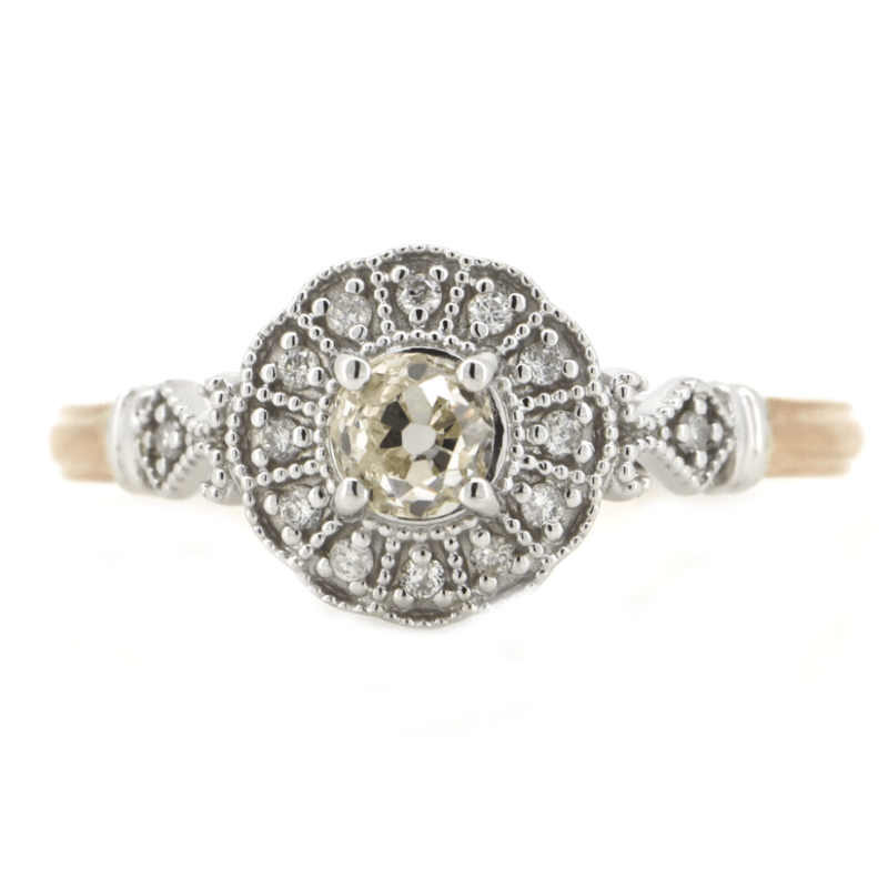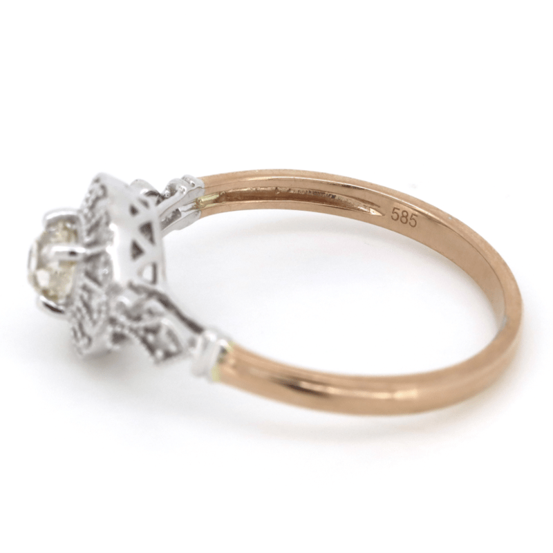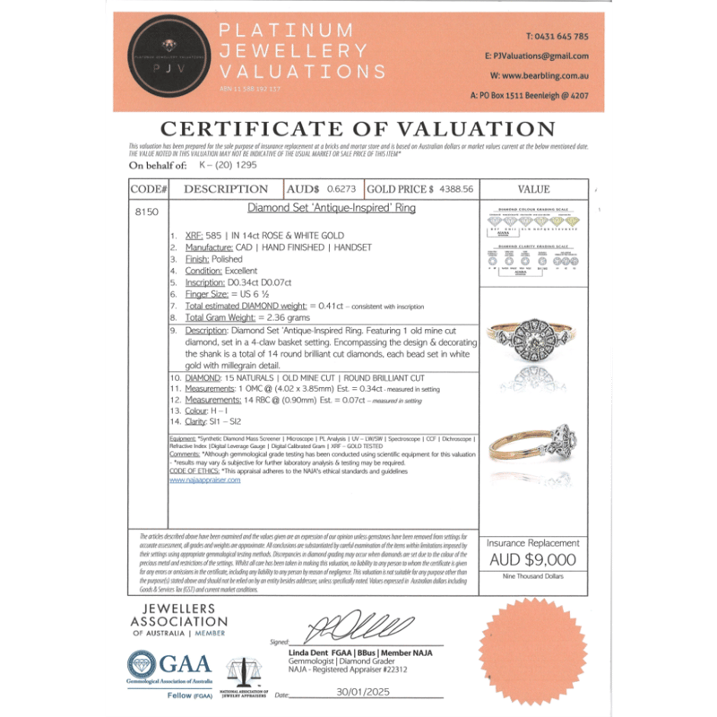 14K ROSE/WHITE GOLD AND DIAMOND, ANTIQUE INSPIRED RING. THE CENTRE FEATURES, ONE OLD MINE CUT, DIAMOND (0.34CT, H-I COLOUR, SI1-SI2 CLARITY), 4 CLAW SET. ENCOMPASSING THE DESIGN AND DECORATING THE SHANK ARE, 14 ROUND BRILLIANT CUT, DIAMONDS (0.07CT TDW, H-I COLOUR, SI1-SI2 CLARITY), BEAD SET IN WHITE GOLD WITH MILLEGRAIN DETAIL. RING SIZE N. Valuations Provided by an Independent Third-Party Professional Not Directly Associated With Lloyds Auctions at AUD $9000This valuation has been conducted by an independent third-party professional. The valuation amount is an assessment by the issuing valuer and does not reflect the auction value of the item. Any inquiries regarding the valuation should be directed to the issuing valuer (refer to contact details on the certificate), as Lloyds Auctions has no affiliation or influence over the valuation, the valuer, or the stated amount. Condition: Good - Refer Images 0645860+98