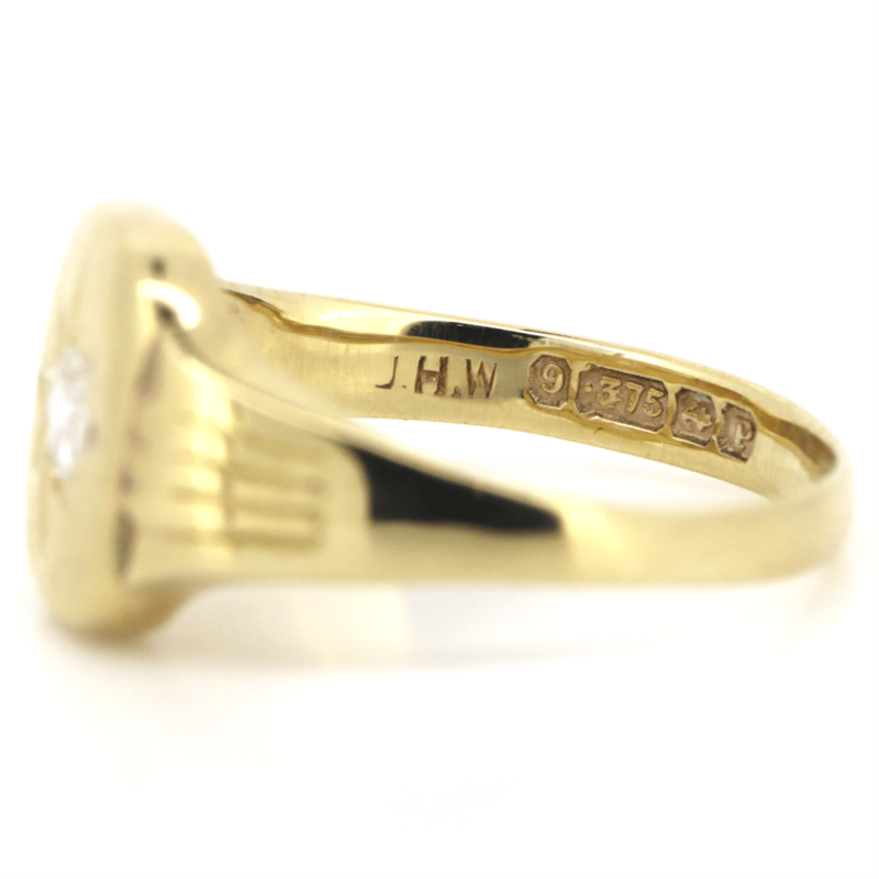 9K YELLOW GOLD AND DIAMOND, SIGNET RING. THE DESIGN FEATURES, ONE ROUND OLD EUROPEAN CUT, DIAMOND (0.12CT, G-H COLOUR, SI CLARITY), STAR SET. RING SIZE N. CONDITION: PRE-OWNED. HALLMARKED BIRMINGHAM ENGLAND CIRCA 1800'S. Valuations Provided by an Independent Third-Party Professional Not Directly Associated With Lloyds Auctions at AUD $6800This valuation has been conducted by an independent third-party professional. The valuation amount is an assessment by the issuing valuer and does not reflect the auction value of the item. Any inquiries regarding the valuation should be directed to the issuing valuer (refer to contact details on the certificate), as Lloyds Auctions has no affiliation or influence over the valuation, the valuer, or the stated amount. Condition: Good - Refer Images 0645860+71