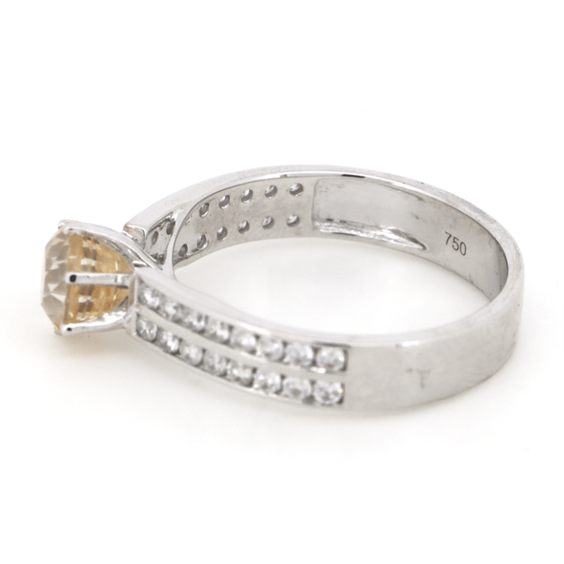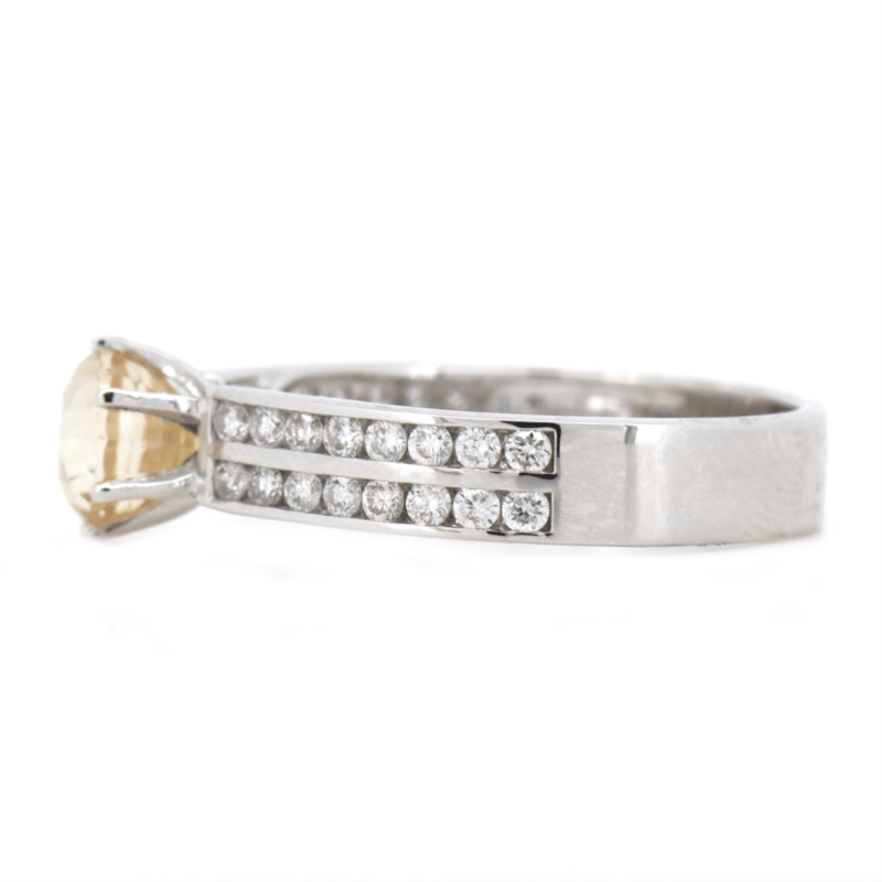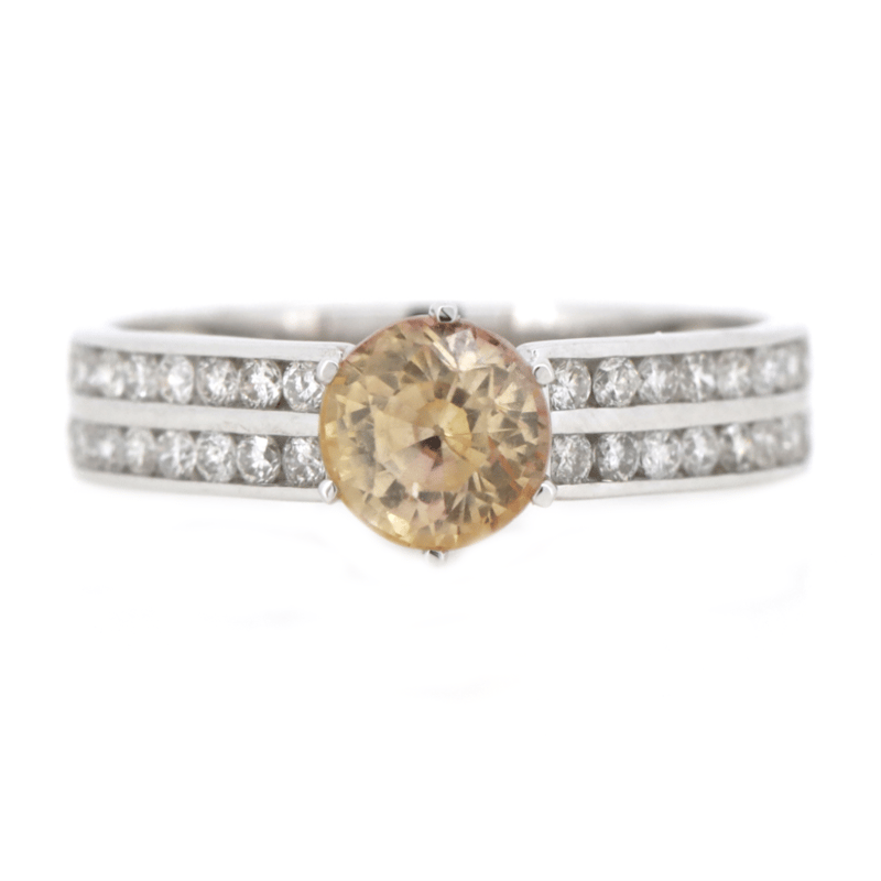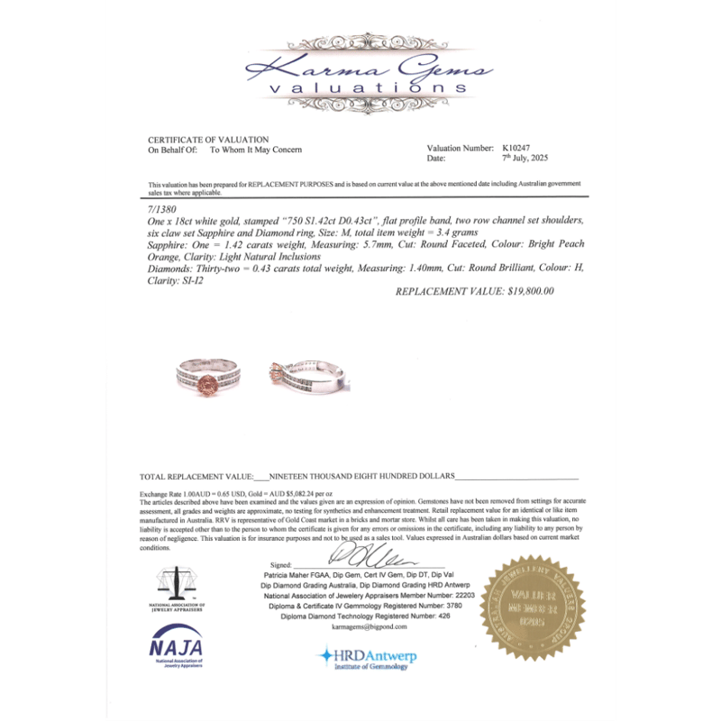 18K WHITE GOLD, ORANGE SAPPHIRE AND DIAMOND, DOUBLE ROW CLASSIC RING. THE CENTRE FEATURES, ONE ROUND FACETED CUT, BRIGHT PEACH ORANGE, SAPPHIRE (1.42CT, LIGHT NATURAL INCLUSIONS), 6 CLAW SET. DECORATING THE BAND IN DOUBLE ROWS ARE, 32 ROUND BRILLIANT CUT, DIAMONDS (0.43CT TDW, H COLOUR, SI-I2 CLARITY), TWO ROW CHANNEL SET. RING SIZE M. Valuations Provided by an Independent Third-Party Professional Not Directly Associated With Lloyds Auctions at AUD $19800This valuation has been conducted by an independent third-party professional. The valuation amount is an assessment by the issuing valuer and does not reflect the auction value of the item. Any inquiries regarding the valuation should be directed to the issuing valuer (refer to contact details on the certificate), as Lloyds Auctions has no affiliation or influence over the valuation, the valuer, or the stated amount. Condition: Good - Refer Images 0645860+58