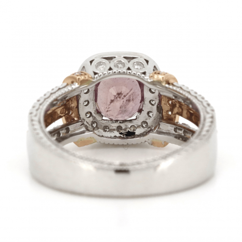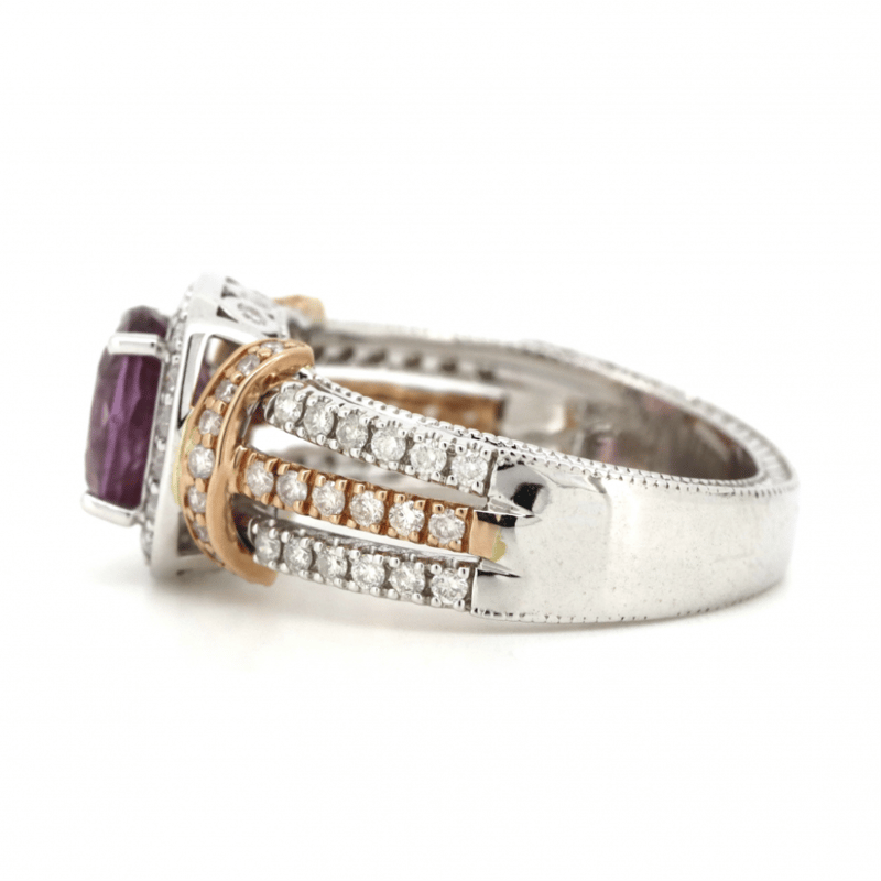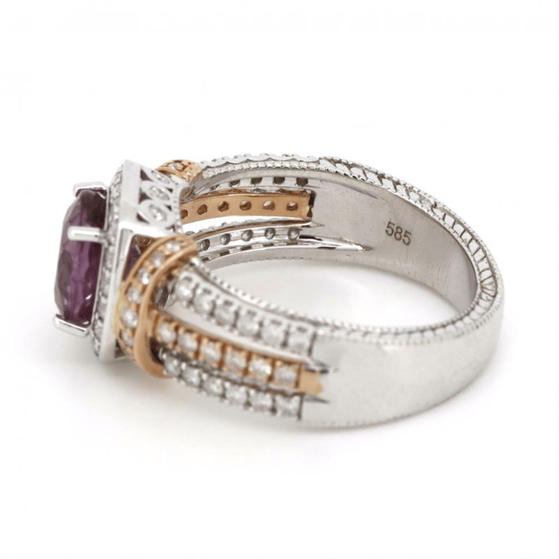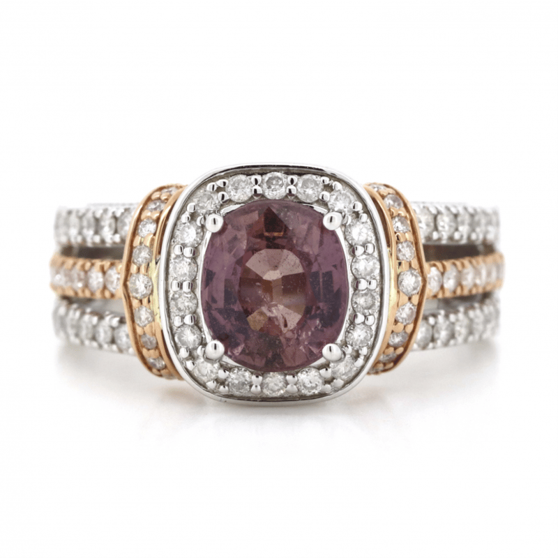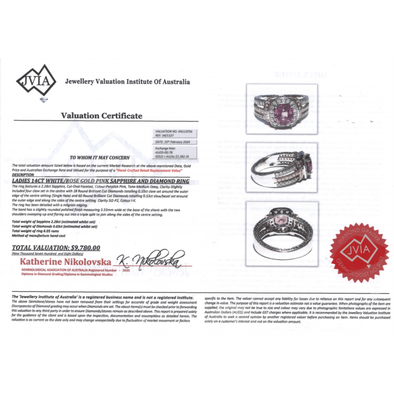 14K WHITE/ROSE GOLD, PINK SAPPHIRE AND DIAMOND, MULTI-SPLIT BAND RING. THE CENTRE FEATURES, ONE OVAL FACETED CUT, MEDIUM DEEP PURPLISH-PINK, SAPPHIRE (2.28CT, SLIGHTLY INCLUDED), 4 CLAW SET. SURROUNDING THE CENTRE IN A HALO AND DECORATING THE SHOULDERS AND TRIPLE SPLIT BAND ARE, 78 ROUND BRILLIANT CUT, DIAMONDS (0.63CT TDW, I-K COLOUR, SI2-P2 CLARITY), CLAW/BEZEL SET. THE RING HAS BEEN DETAILED WITH MILLEGRAIN EDGING. RING SIZE M. Valuations Provided by an Independent Third-Party Professional Not Directly Associated With Lloyds Auctions at AUD $9780This valuation has been conducted by an independent third-party professional. The valuation amount is an assessment by the issuing valuer and does not reflect the auction value of the item. Any inquiries regarding the valuation should be directed to the issuing valuer (refer to contact details on the certificate), as Lloyds Auctions has no affiliation or influence over the valuation, the valuer, or the stated amount. Condition: Good - Refer Images 0645860+64