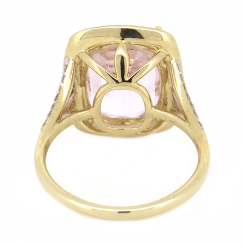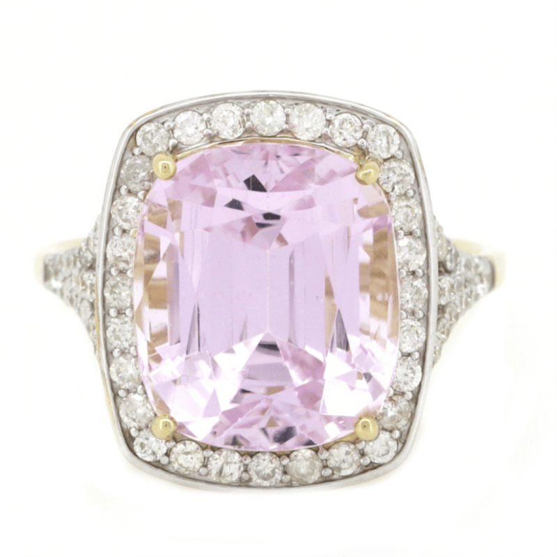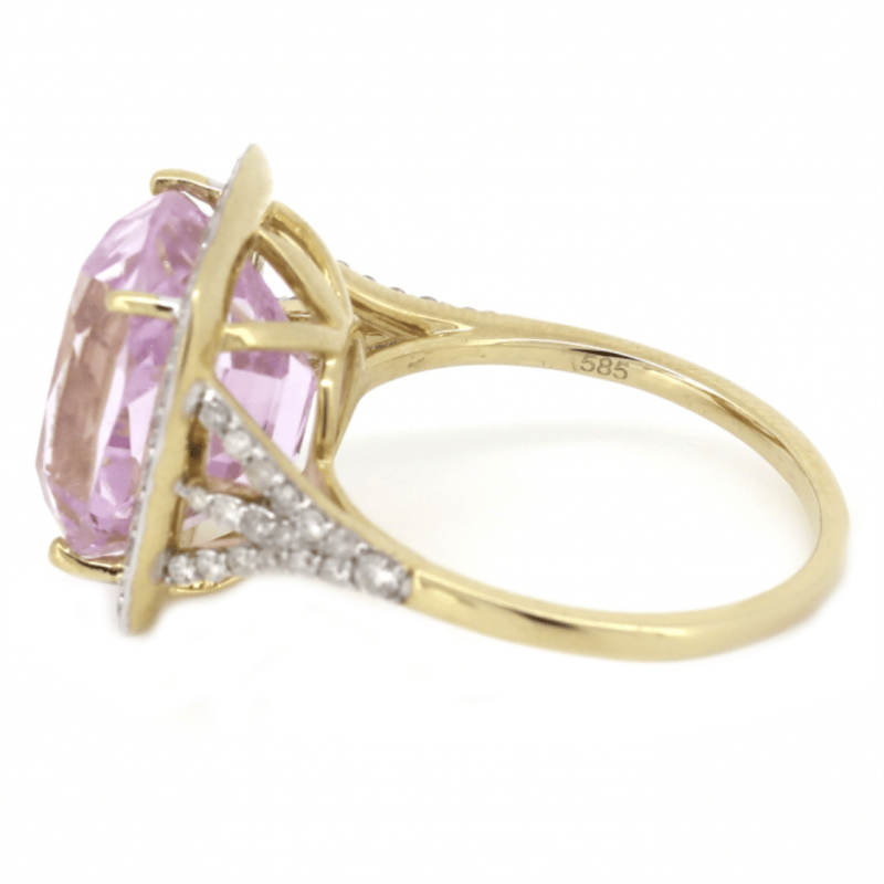 14K YELLOW GOLD, 8.17CT KUNZITE AND DIAMOND, STATEMENT RING. THE CENTRE FEATURES, ONE CUSHION CUT, MEDIUM LIGHT PINKISH-PURPLE, KUNZITE (8.17CT, MINOR EYE VISIBLE INCLUSIONS), CLAW SET. SURROUNDING THE CENTRE IN A HALO AND DECORATING THE BAND ARE, 66 ROUND BRILLIANT CUT, DIAMONDS (0.70CT TDW, J-K COLOUR, SI2-I2 CLARITY), BEAD SET IN WHITE GOLD. RING SIZE P. Valuations Provided by an Independent Third-Party Professional Not Directly Associated With Lloyds Auctions at AUD $10190This valuation has been conducted by an independent third-party professional. The valuation amount is an assessment by the issuing valuer and does not reflect the auction value of the item. Any inquiries regarding the valuation should be directed to the issuing valuer (refer to contact details on the certificate), as Lloyds Auctions has no affiliation or influence over the valuation, the valuer, or the stated amount. Condition: Good - Refer Images 0645860+6