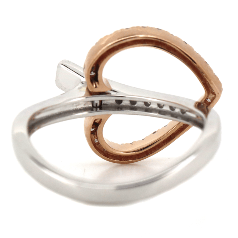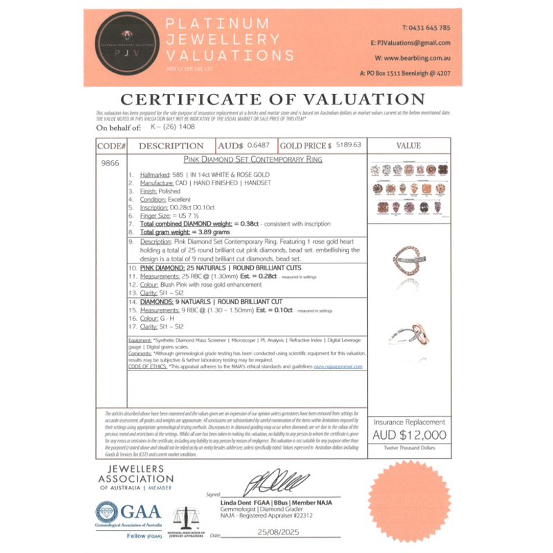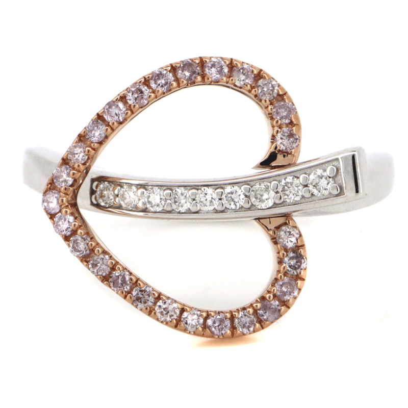 14K WHITE/ROSE GOLD, PINK DIAMOND AND DIAMOND, CONTEMPORARY RING. THE DESIGN FEATURES, ONE ROSE GOLD HEART HOLDING 25 ROUND BRILLIANT CUT, BLUSH PINK, DIAMONDS (0.25CT TDW, SI1-SI2 CLARITY), BEAD SET. EMBELLISHING THE DESIGN ARE, 9 ROUND BRILLIANT CUT, DIAMONDS (0.10CT TDW, G-H COLOUR, SI1-SI2 CLARITY), BEAD SET. RING SIZE O 1/2. Valuations Provided by an Independent Third-Party Professional Not Directly Associated With Lloyds Auctions at AUD $12000This valuation has been conducted by an independent third-party professional. The valuation amount is an assessment by the issuing valuer and does not reflect the auction value of the item. Any inquiries regarding the valuation should be directed to the issuing valuer (refer to contact details on the certificate), as Lloyds Auctions has no affiliation or influence over the valuation, the valuer, or the stated amount. Condition: Good - Refer Images 0645860+65