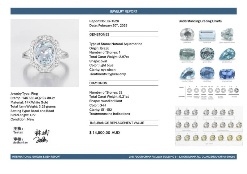 14CT WHITE GOLD BRAZILIAN AQUAMARINE AND DIAMOND ANTIQUE INSPIRED RING FEATURING CENTRE, ONE OVAL CUT, LIGHT BLUE BRAZILIAN AQUAMARINE (2.97CT, EYE CLEAN), BEZEL SET, WITH 32 ROUND BRILLIANT CUT DIAMONDS (0.21CT TDW, G-H COLOUR, SI1-SI2 CLARITY), BEAD SET. RING SIZE O. Valuations Provided by an Independent Third-Party Professional Not Directly Associated With Lloyds Auctions at AUD $14500This valuation has been conducted by an independent third-party professional. The valuation amount is an assessment by the issuing valuer and does not reflect the auction value of the item. Any inquiries regarding the valuation should be directed to the issuing valuer (refer to contact details on the certificate), as Lloyds Auctions has no affiliation or influence over the valuation, the valuer, or the stated amount. Condition: Good - Refer Images 0586199+1312
