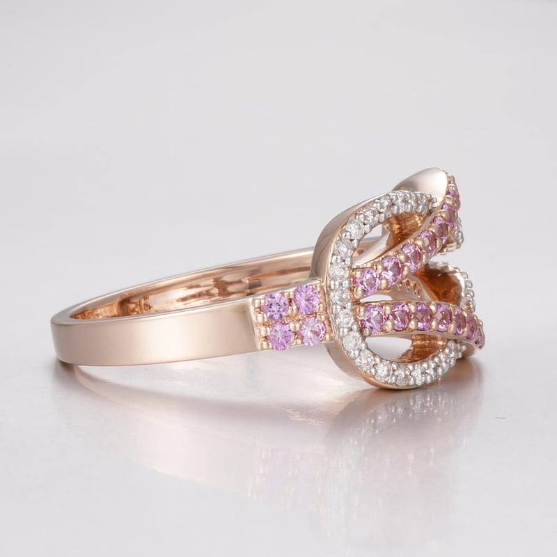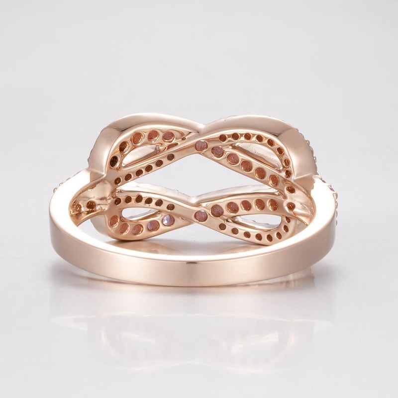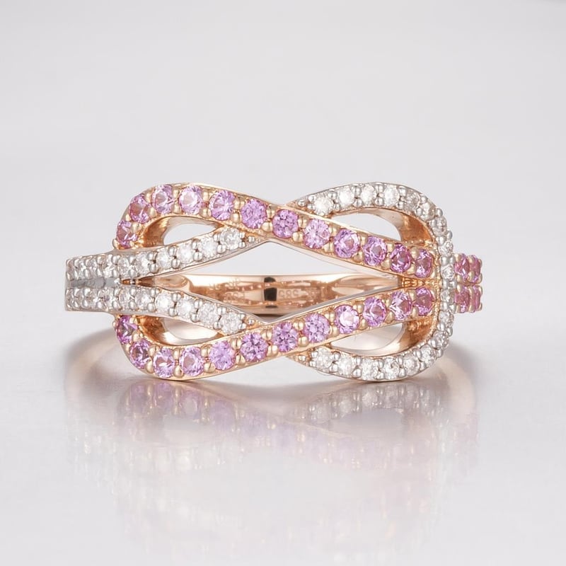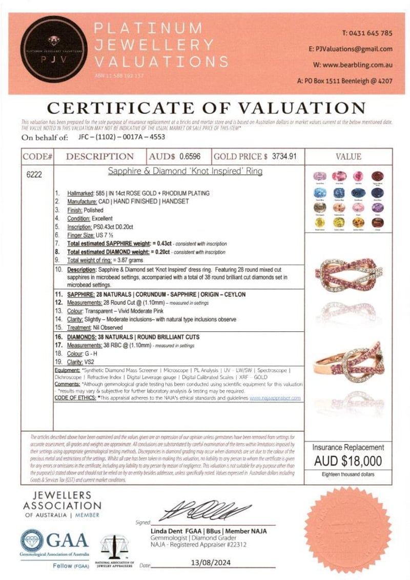 14CT ROSE GOLD PINK CEYLON SAPPHIRE AND DIAMOND KNOT INSPIRED RING FEATURING CENTRE, 28 ROUND CUT, VIVID MODERATE PINK CEYLON SAPPHIRES (0.43CT TSW, SLIGHTLY-MODERATELY INCLUDED), BEAD SET, WITH 38 ROUND BRILLIANT CUT DIAMONDS (0.20CT TDW, G-H COLOUR, VS2 CLARITY), BEAD SET. RING SIZE O. Valuations Provided by an Independent Third-Party Professional Not Directly Associated With Lloyds Auctions at AUD $18000This valuation has been conducted by an independent third-party professional. The valuation amount is an assessment by the issuing valuer and does not reflect the auction value of the item. Any inquiries regarding the valuation should be directed to the issuing valuer (refer to contact details on the certificate), as Lloyds Auctions has no affiliation or influence over the valuation, the valuer, or the stated amount. Condition: Good - Refer Images 0586199+1329