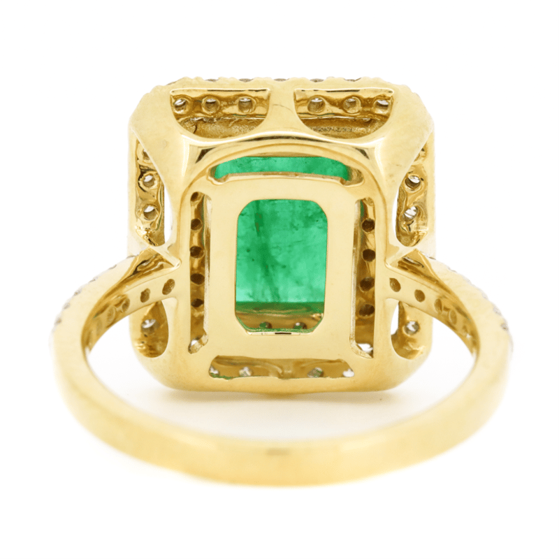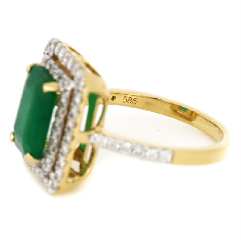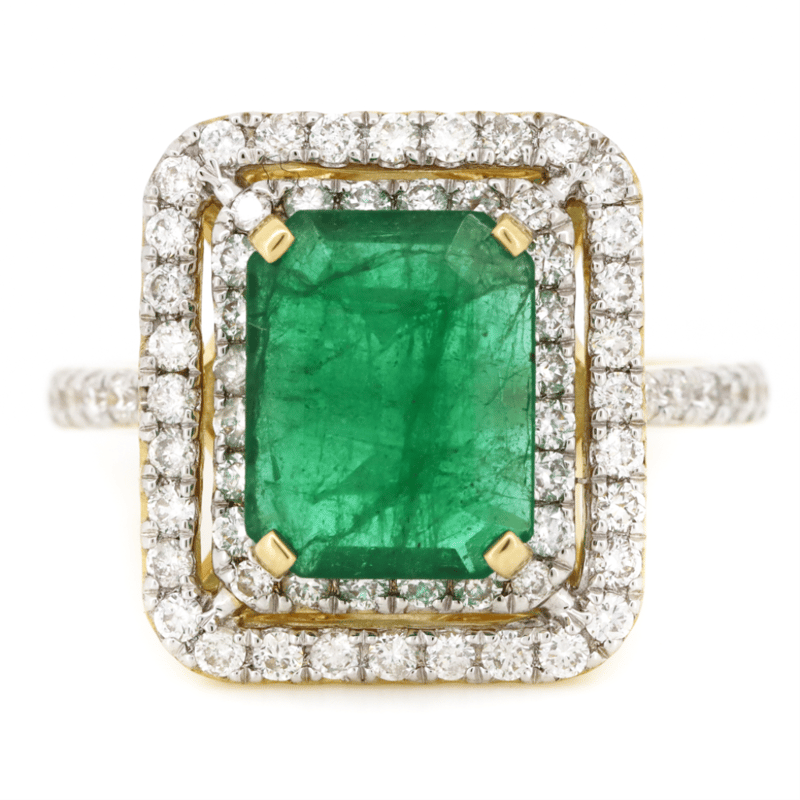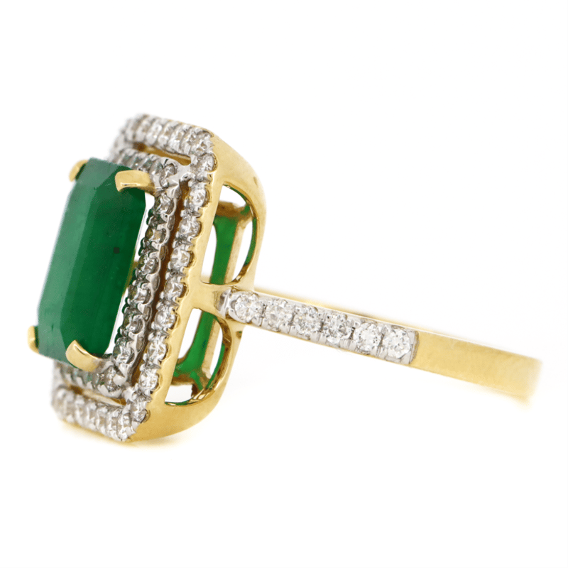 14K YELLOW GOLD, EMERALD AND DIAMOND, DOUBLE HALO RING. THE CENTRE FEATURES ONE EMERALD CUT, MODERATE GREEN, EMERALD (2.24CT, MODERATELY INCLUDED- CLARITY), 4 CLAW SET. SURROUNDING THE CENTRE IN A DOUBLE HALO AND DECORATING THE BAND ARE, 68 ROUND BRILLIANT CUT, DIAMONDS (0.70CT, G-H COLOUR, SI1-SI2 CLARITY), MICRO-CLAW SET IN WHITE GOLD.