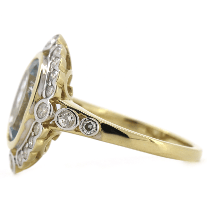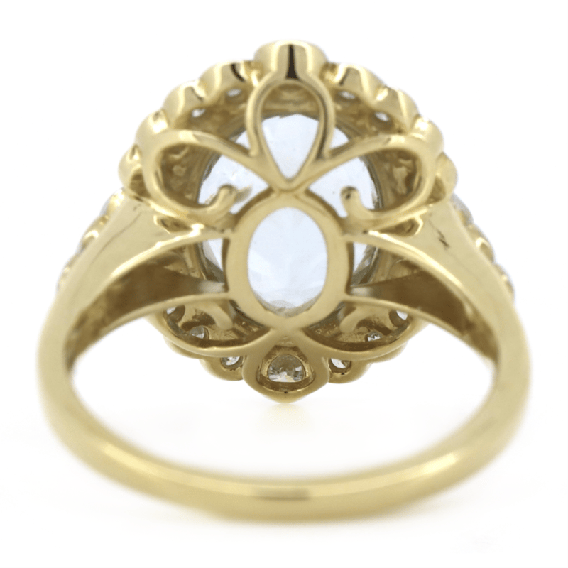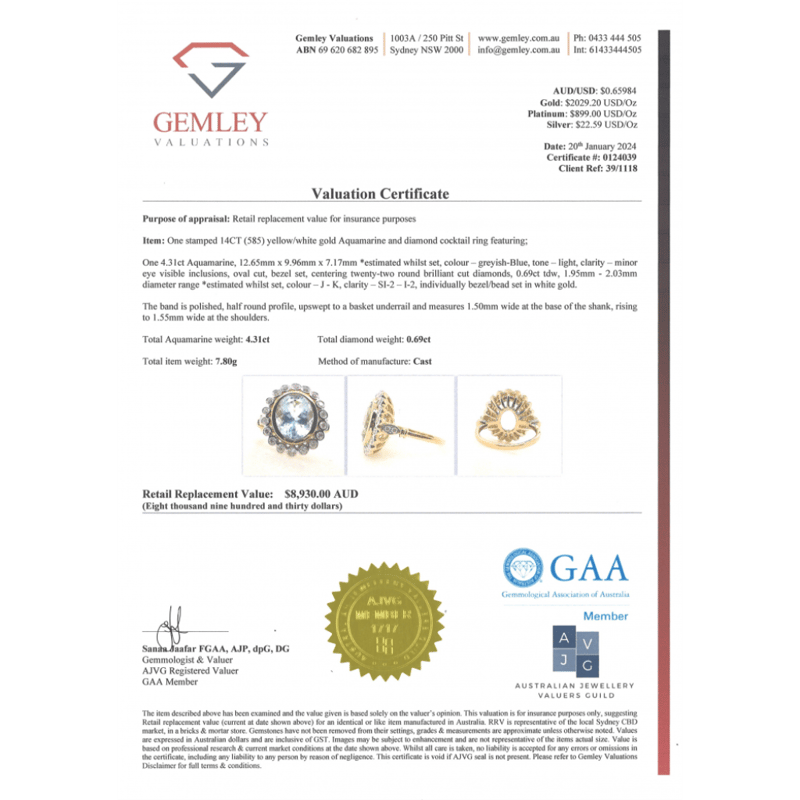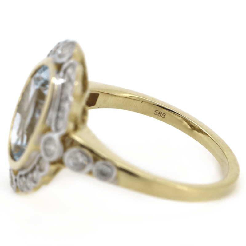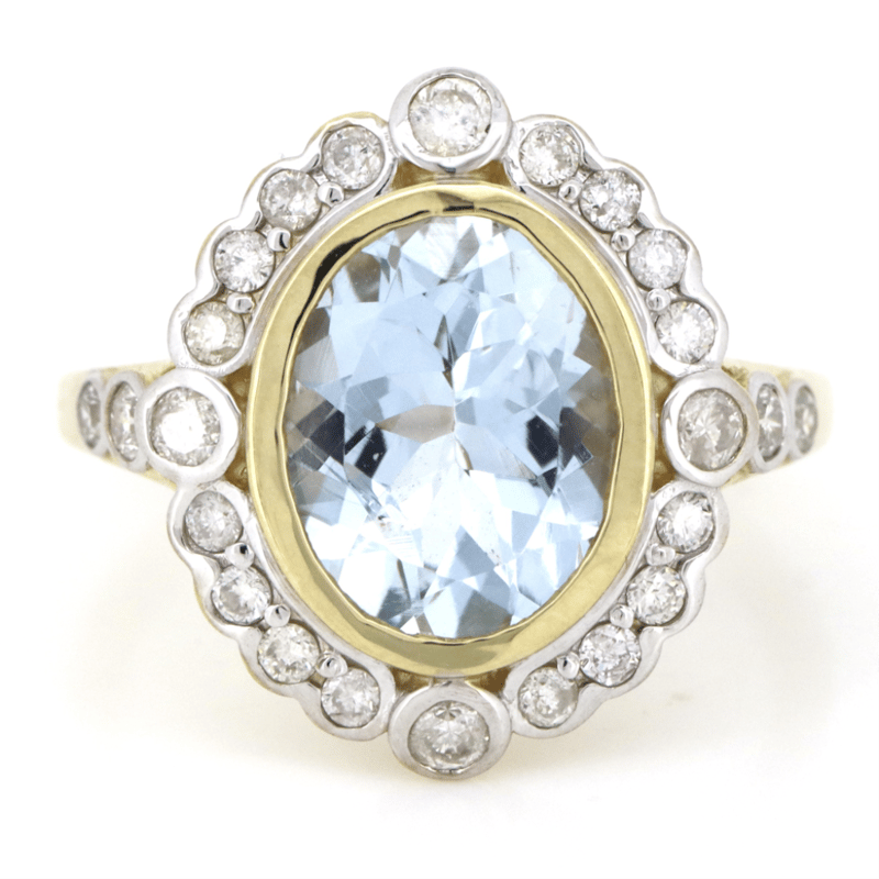 14K YELLOW GOLD, AQUAMARINE AND DIAMOND, HALO RING. THE CENTRE FEATURES, ONE OVAL CUT, LIGHT GREYISH-BLUE, AQUAMARINE (4.31CT TSW, MINOR EYE VISIBLE INCLUSIONS), BEZEL SET. SURROUNDING THE CENTRE IN A HALO AND DECORATING THE BAND ARE, 22 ROUND BRILLIANT CUT, DIAMONDS (0.69CT TDW, J-K COLOUR, SI2-I2 CLARITY), BEZEL/BEAD SET IN WHITE GOLD. RING SIZE O.