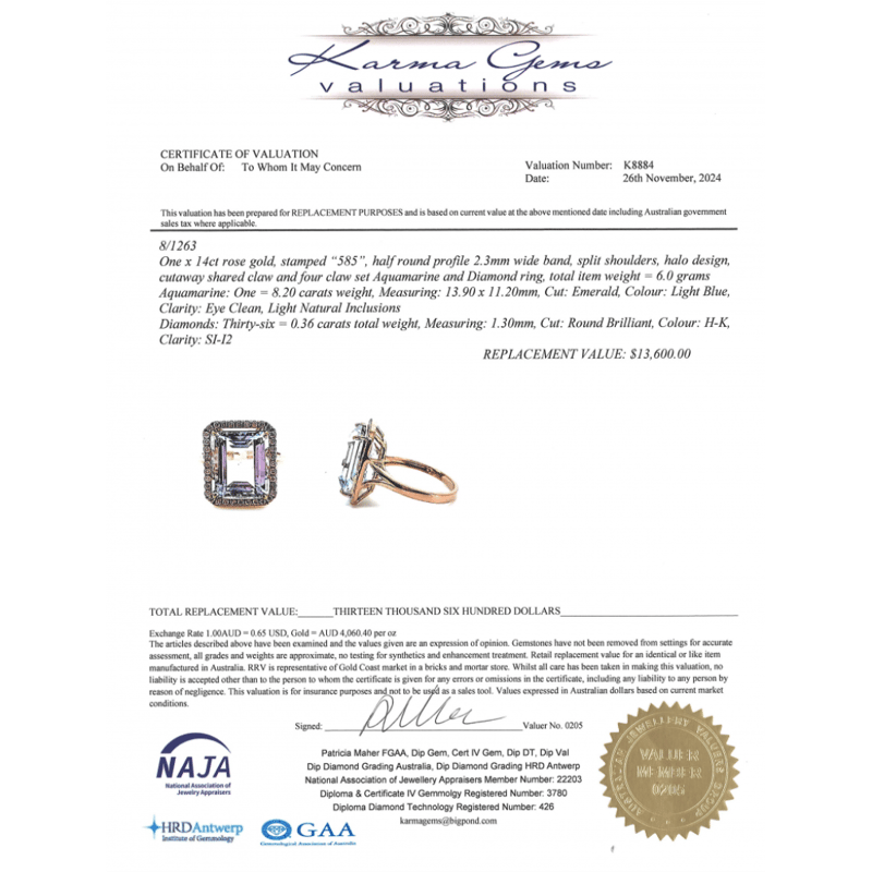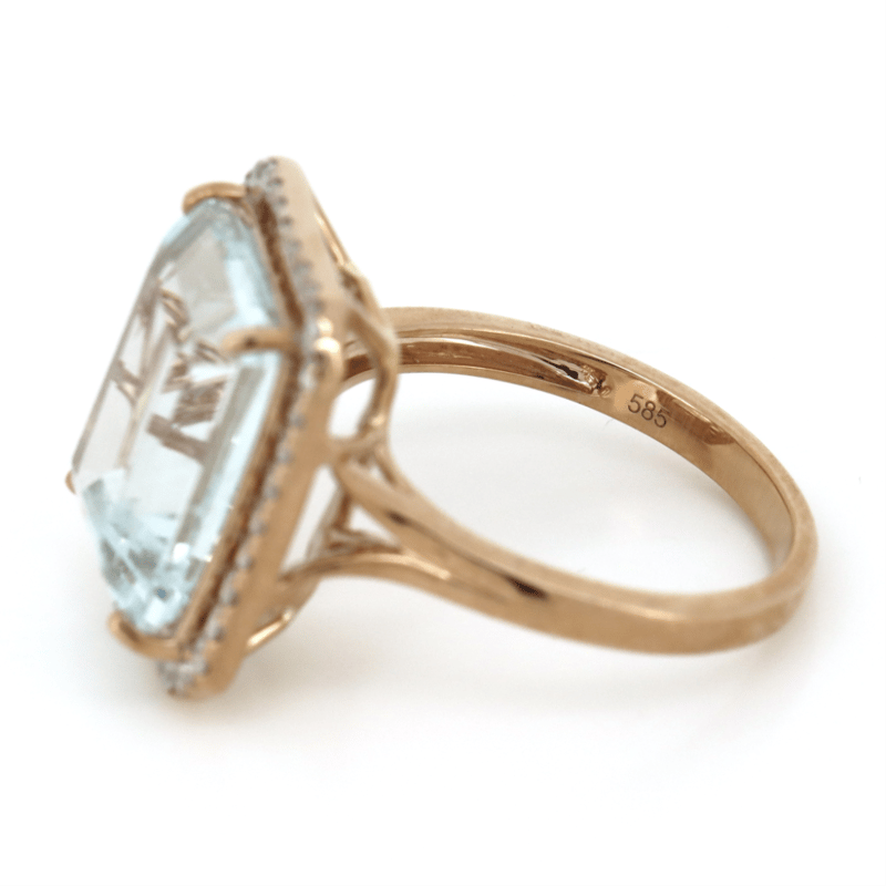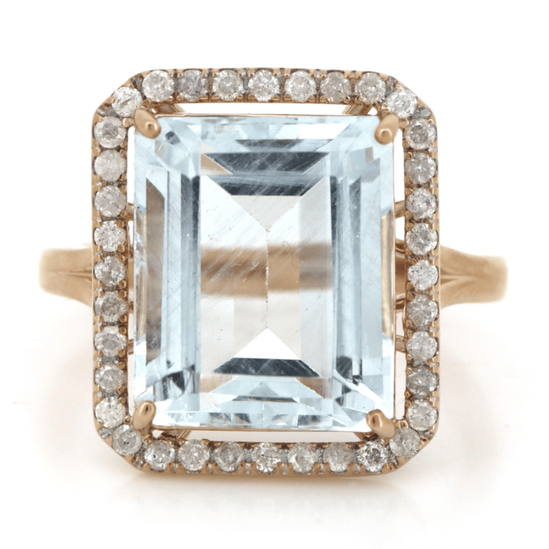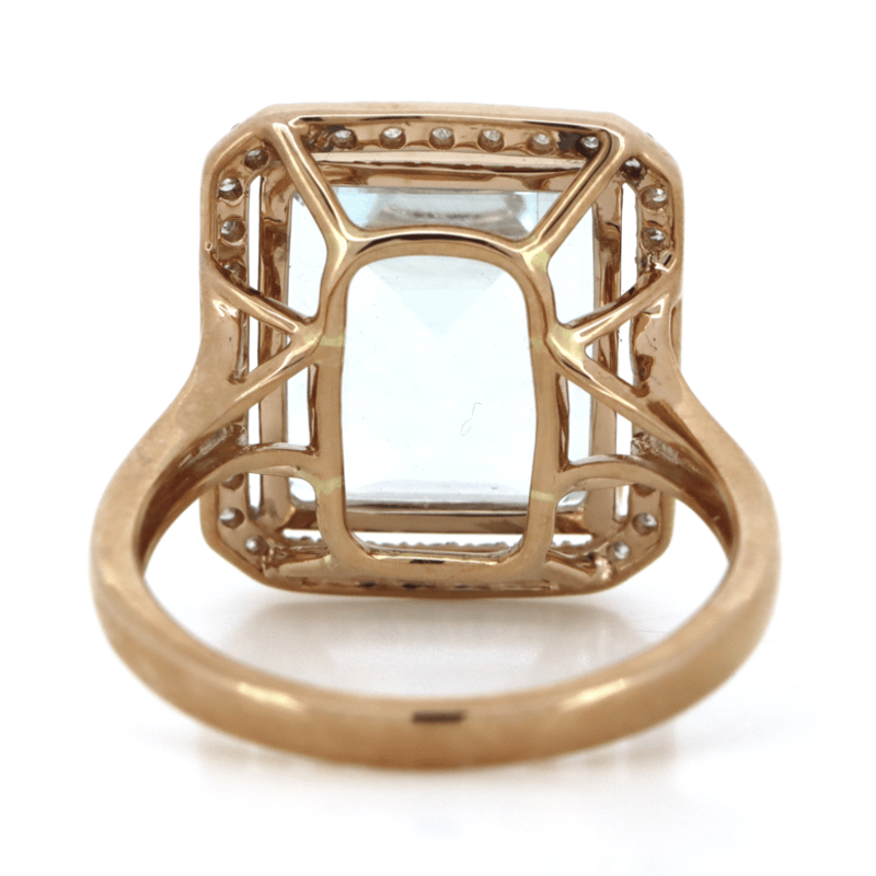 14K ROSE GOLD, 8.20CT AQUAMARINE AND DIAMOND, STATEMENT RING. THE CENTRE FEATURES, ONE EMERALD CUT, LIGHT BLUE, AQUAMARINE (8.20CT, EYE CLEAN CLARITY), 4 CLAW SET. DECORATING THE BAND IN A HALO ARE, 36 ROUND BRILLIANT CUT, DIAMONDS (0.36CT TDW, H-K COLOUR, SI-I2 CLARITY), BEAD/CLAW SET. RING SIZE Q.
