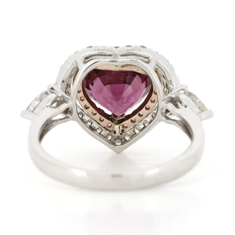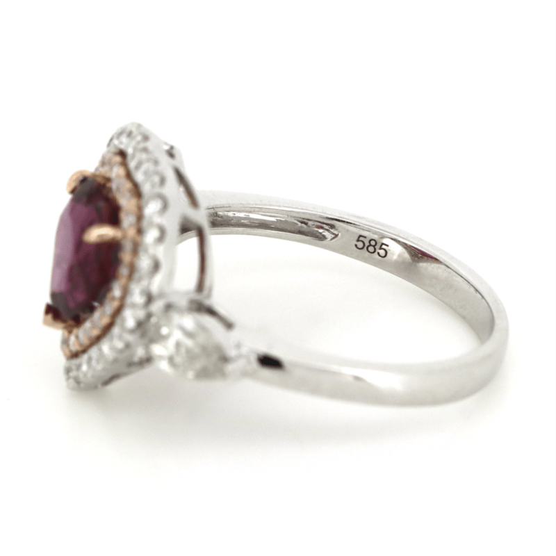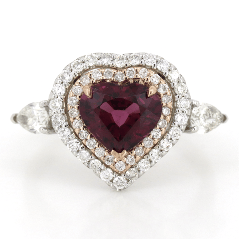 14K WHITE/ROSE GOLD, RHODOLITE GARNET AND DIAMOND, DOUBLE HALO RING. THE CENTRE FEATURES, ONE HEART CUT, PINKISH-PURPLE, RHODOLITE GARNET (1.80CT, EYE CLEAN CLARITY), CLAW SET IN ROSE GOLD. FLANKING THE CENTRE ARE, 2 PEAR BRILLIANT CUT, DIAMONDS (0.40CT TDW, H-I COLOUR, SI1-2 CLARITY), VEE CLAW SET. SURROUNDING THE CENTRE IN THE INNERMOST HALO ARE, 24 ROUND BRILLIANT CUT, DIAMONDS (0.12CT TDW, H-I COLOUR, SI-I2 CLARITY), MICRO-CLAW SET IN ROSE GOLD. SURROUNDING THE CENTRE IN THE OUTERMOST HALO ARE, 26 ROUND BRILLIANT CUT, DIAMONDS (0.25CT TDW, H-I COLOUR, SI-I2 CLARITY), CLAW SET IN WHITE GOLD. RING SIZE M.