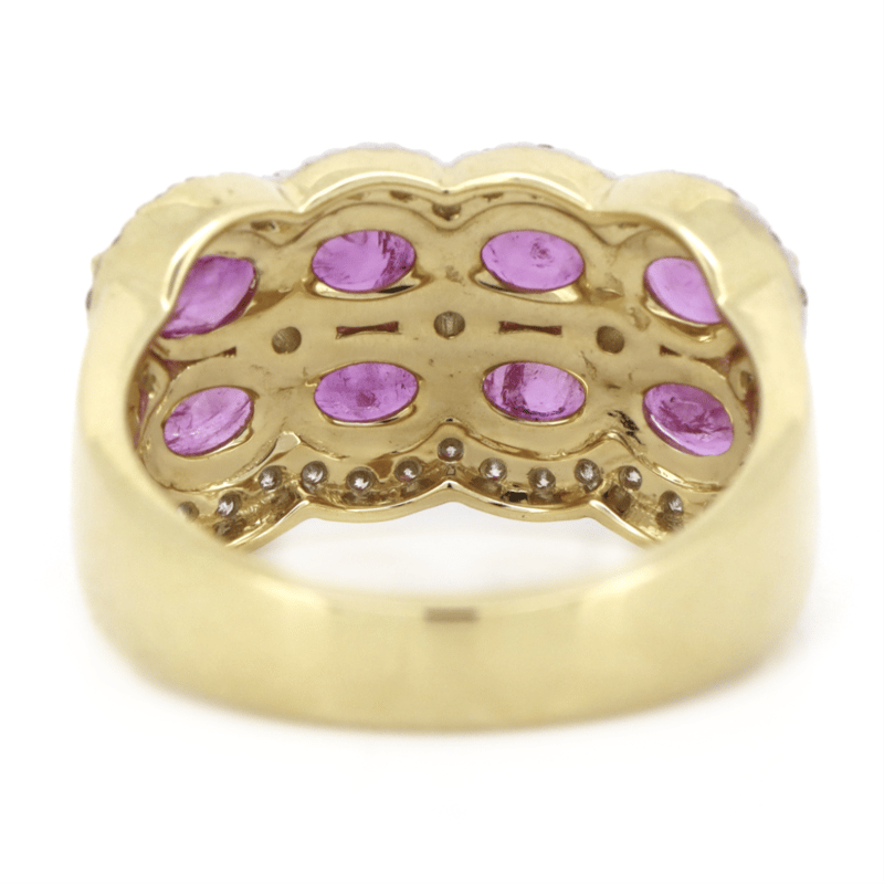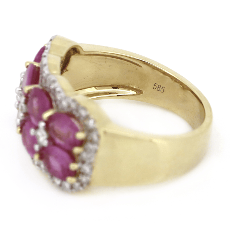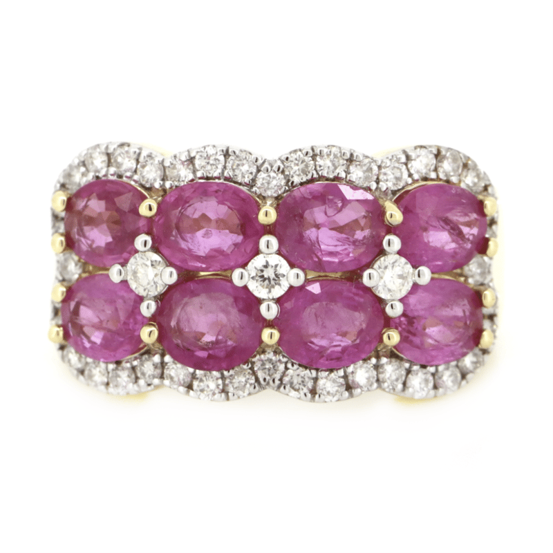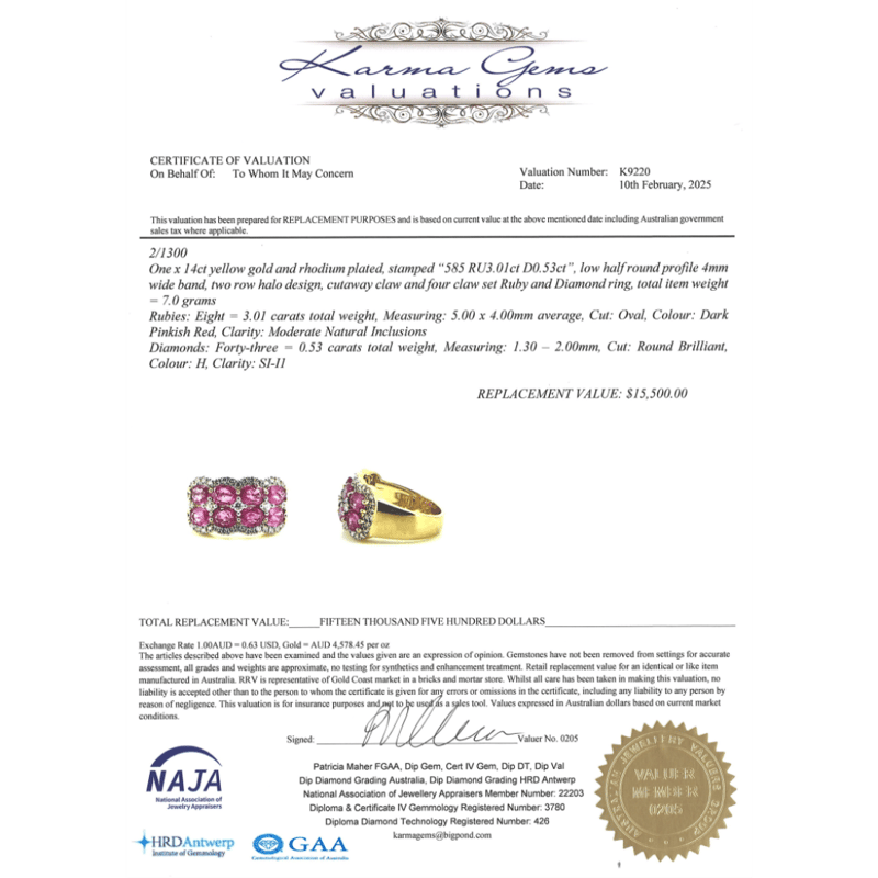 14K YELLOW GOLD, RUBY AND DIAMOND, DECORATIVE RING. THE DESIGN FEATURES, 8 OVAL CUT, DARK PINKISH-RED, RUBIES (3.01CT TSW, MODERATE NATURAL INCLUSIONS-CLARITY), CLAW SET. ACCOMPANIED BY, 43 ROUND BRILLIANT CUT, DIAMONDS (0.53CT TDW, H-I COLOUR, SI-I1 CLARITY), MICRO-CLAW SET IN WHITE GOLD. RING SIZE O. Valuations Provided by an Independent Third-Party Professional Not Directly Associated With Lloyds Auctions at AUD $15500This valuation has been conducted by an independent third-party professional. The valuation amount is an assessment by the issuing valuer and does not reflect the auction value of the item. Any inquiries regarding the valuation should be directed to the issuing valuer (refer to contact details on the certificate), as Lloyds Auctions has no affiliation or influence over the valuation, the valuer, or the stated amount. Condition: Good - Refer Images 0645866+55