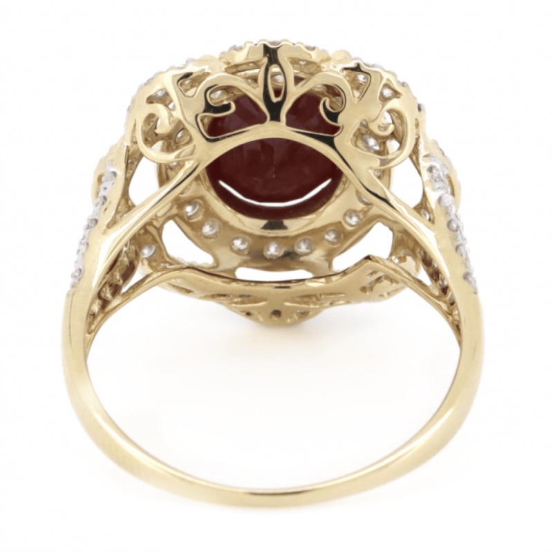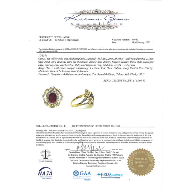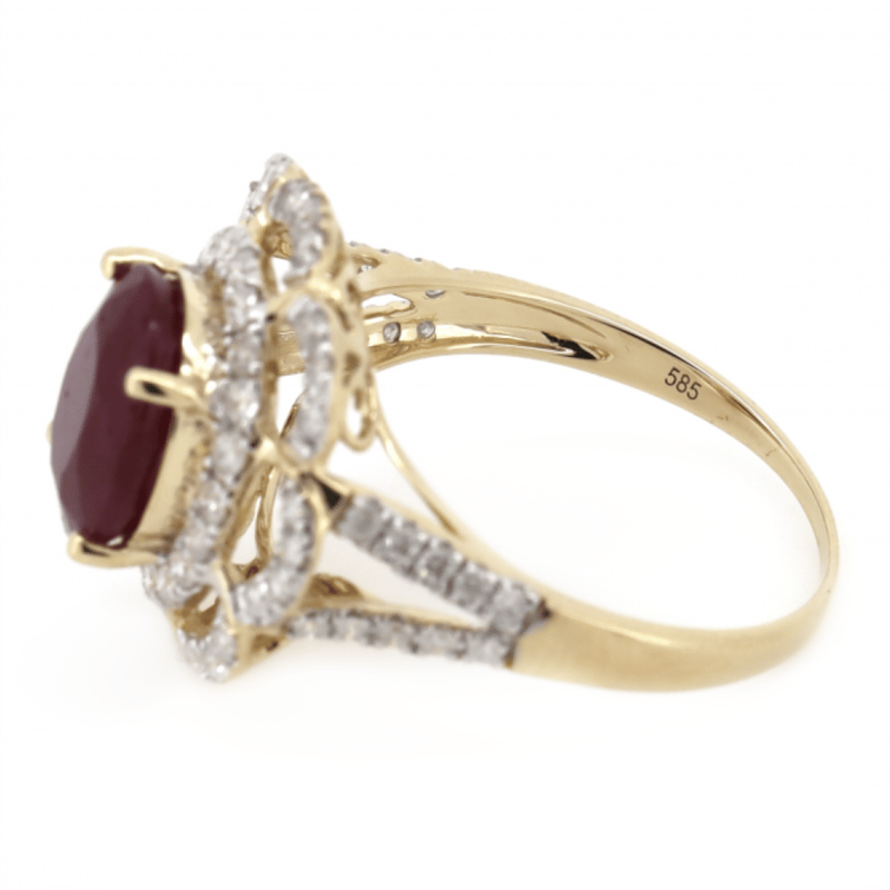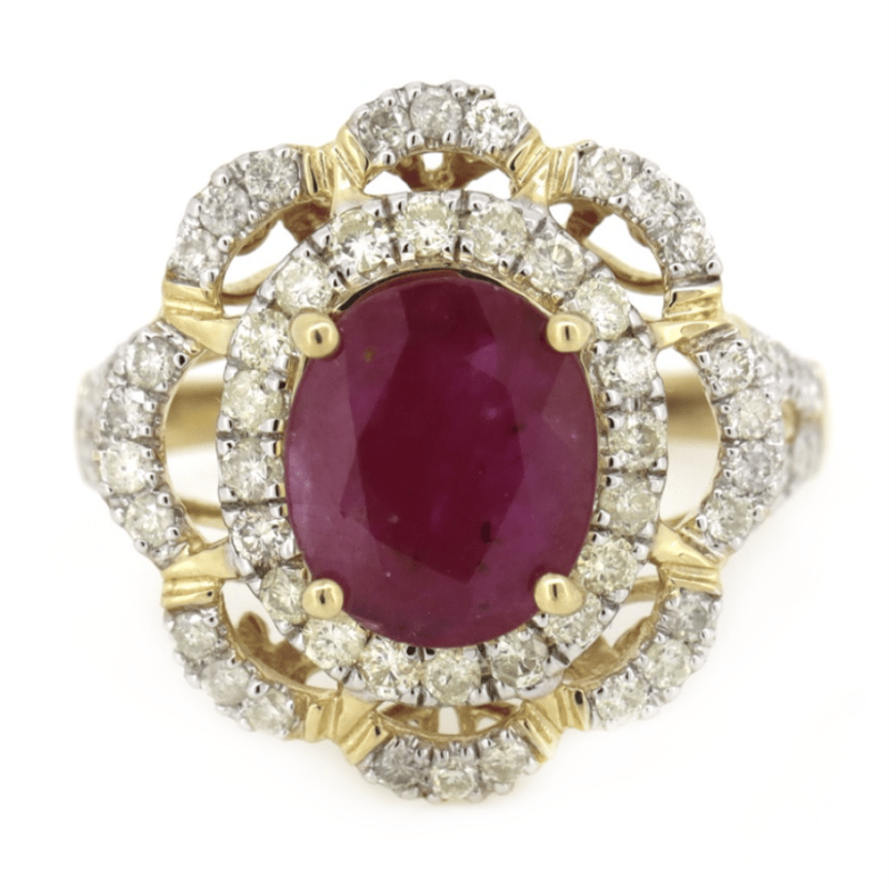 14K YELLOW GOLD, RUBY AND DIAMOND, FLORAL RING. THE CENTRE FEATURES, ONE OVAL CUT, MEDIUM DEEP PINKISH-RED, RUBY (2.20CT, MODERATE NATURAL INCLUSIONS, HEAT ENHANCED), 4 CLAW SET. DECORATING THE FLORAL HALO AND SPLIT BAND ARE, 66 ROUND BRILLIANT CUT, DIAMONDS (0.816.CT TDW, H-I COLOUR, SI-I1 CLARITY), CLAW SET IN WHITE GOLD. RING SIZE Q.