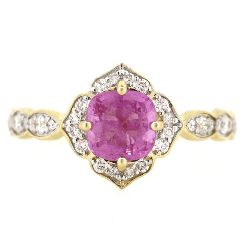 14K YELLOW GOLD, PINK SAPPHIRE AND DIAMOND, HALO RING. THE CENTRE FEATURES, ONE OVAL CUT, MODERATE VIVID PINK, SAPPHIRE (1.06CT, SLIGHTLY INCLUDED), 4 CLAW SET. SURROUNDING THE CENTRE ARE, 34 ROUND BRILLIANT CUT, DIAMONDS (0.30CT TDW, G-H COLOUR, SI1-SI2 CLARITY), BEAD SET. RING SIZE N 1/2.