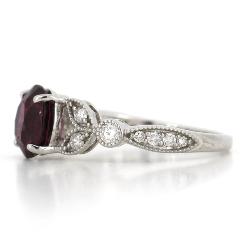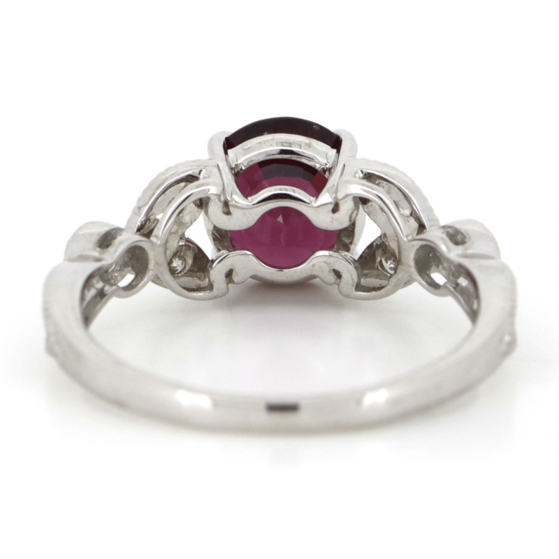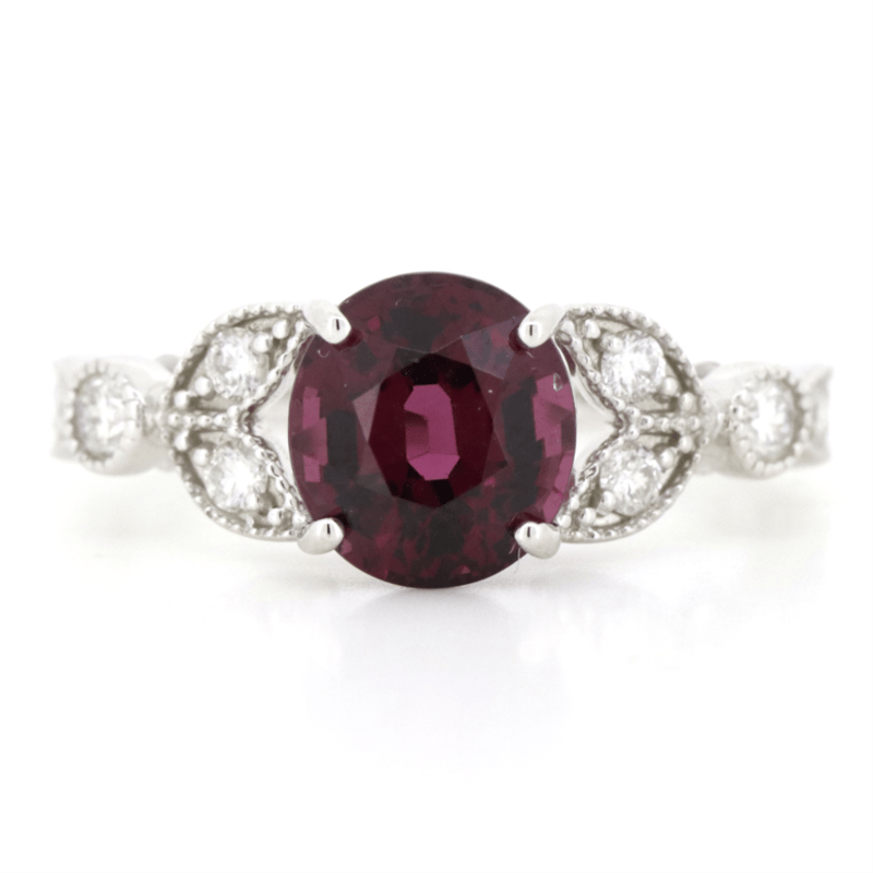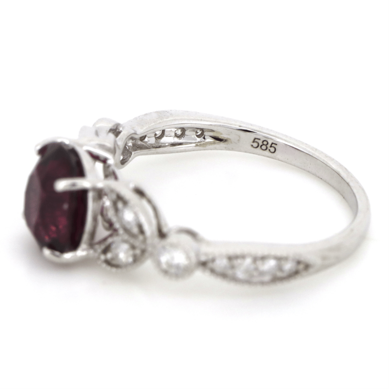 14K WHITE GOLD GARNET AND DIAMOND, DRESS RING. THE CENTRE FEATURES, ONE ROUND BRILLIANT CUT, MODERATE PURPLISH-RED, GARNET (2.42CT, EYE CLEAN CLARITY), CLAW SET. DECORATING THE SETTING ARE, 14 ROUND BRILLIANT CUT, DIAMONDS (0.29CT TDW, G-H COLOUR, SI1-SI2 CLARITY), BEAD/BEZEL SET. RING SIZE M 1/2. Valuations Provided by an Independent Third-Party Professional Not Directly Associated With Lloyds Auctions at AUD $10000This valuation has been conducted by an independent third-party professional. The valuation amount is an assessment by the issuing valuer and does not reflect the auction value of the item. Any inquiries regarding the valuation should be directed to the issuing valuer (refer to contact details on the certificate), as Lloyds Auctions has no affiliation or influence over the valuation, the valuer, or the stated amount. Condition: Good - Refer Images 0645866+66