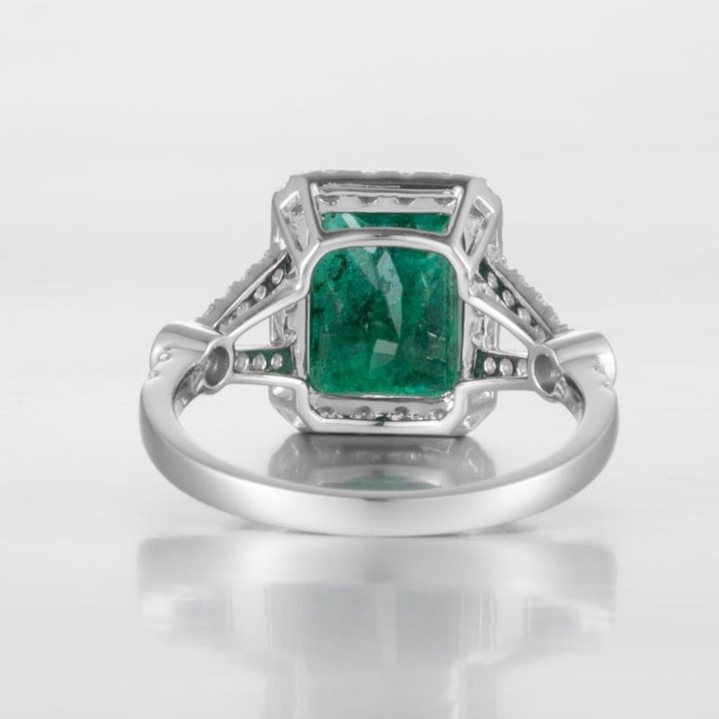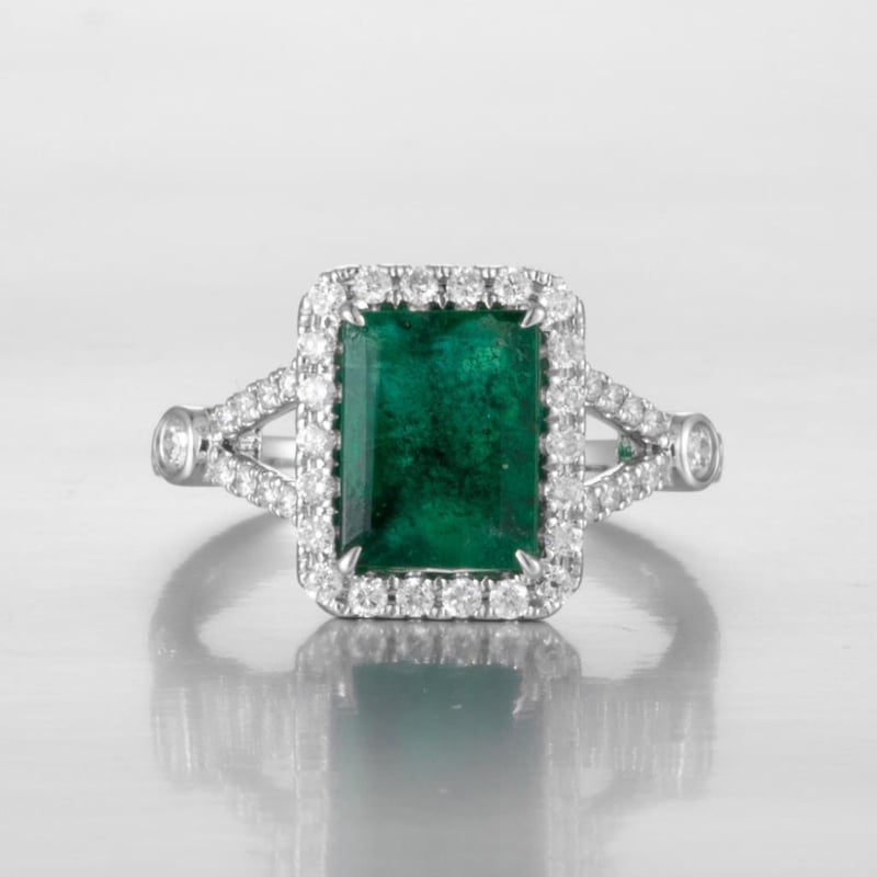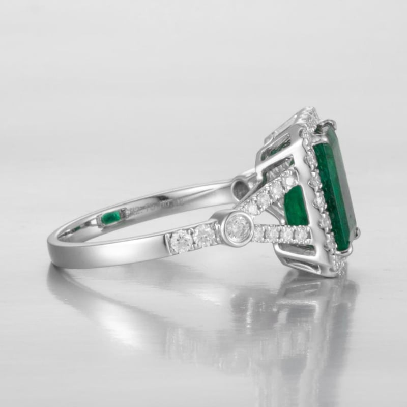 14CT WHITE GOLD ZAMBIAN EMERALD AND DIAMOND HALO RING FEATURING CENTRE, ONE EMERALD CUT, DARK VIVID BLUISH-GREEN ZAMBIAN EMERALD (2.70CT, HEAVY INCLUSIONS), CLAW SET, WITH 44 ROUND BRILLIANT CUT DIAMONDS (0.48CT TDW, G-H COLOUR, VS2-SI1 CLARITY), CLAW/BEZEL SET. RING SIZE O.