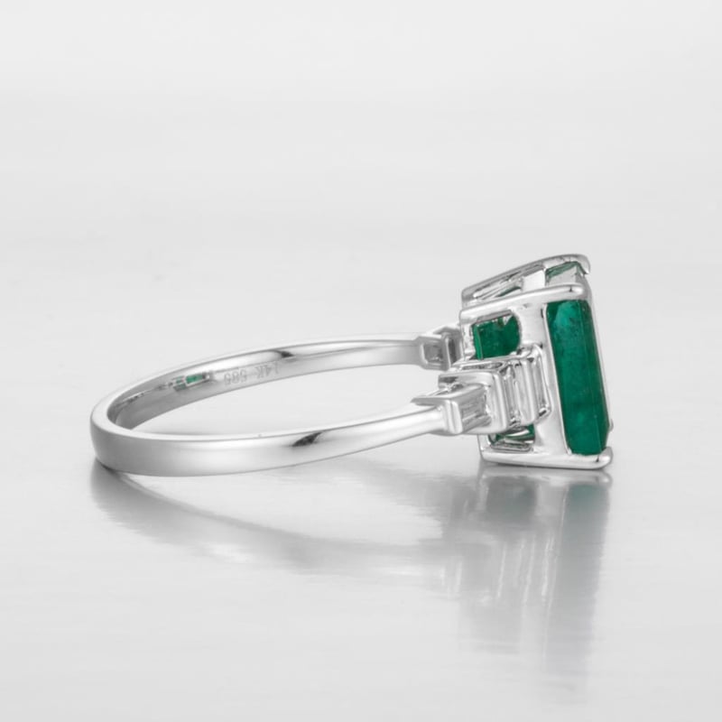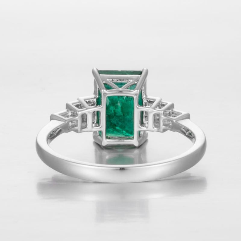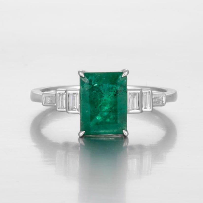 14CT WHITE GOLD ZAMBIAN EMERALD AND DIAMOND DRESS RING FEATURING CENTRE, ONE EMERALD CUT, MEDIUM VIVID BLUISH-GREEN ZAMBIAN EMERALD (2.38CT, HEAVY INCLUSIONS), CLAW SET, WITH 6 BAGUETTE CUT DIAMONDS (0.18CT TDW, G-H COLOUR, VS1-VS2 CLARITY CLARITY), CHANNEL SET. RING SIZE O.