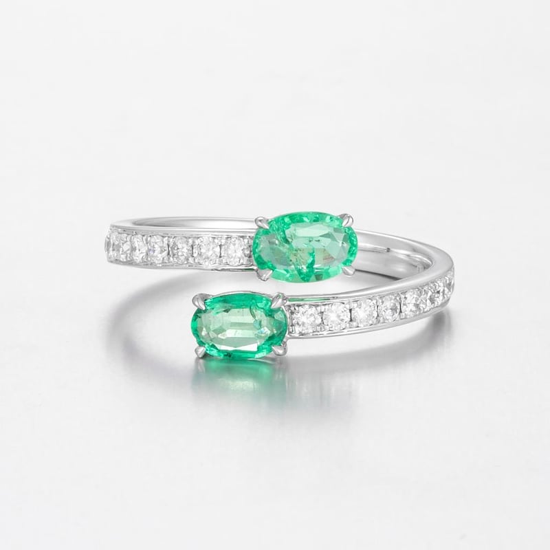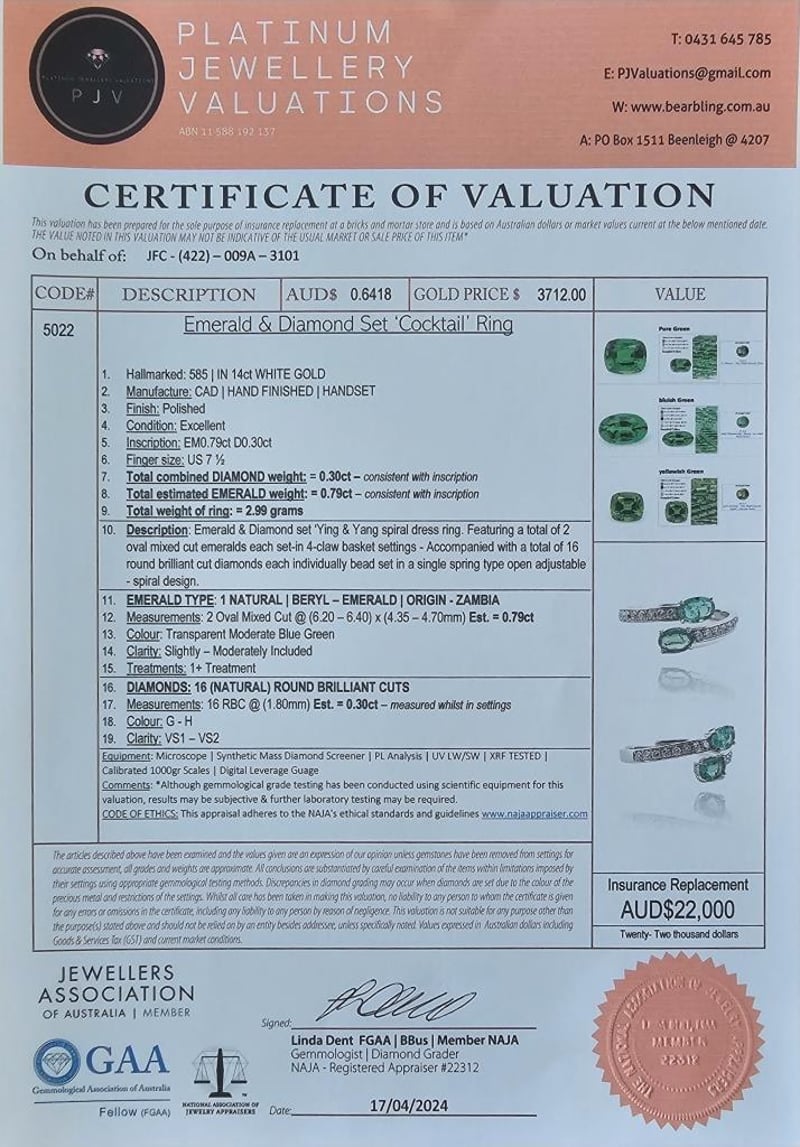 14CT WHITE GOLD ZAMBIAN EMERALD AND DIAMOND SPIRAL RING FEATURING CENTRE, 2 OVAL CUT, MODERATE BLUE-GREEN ZAMBIAN EMERALDS (0.79CT TSW, SLIGHTLY-MODERATELY INCLUDED), CLAW SET, WITH 16 ROUND BRILLIANT CUT DIAMONDS (0.30CT TDW, G-H COLOUR, VS1-VS2 CLARITY), BEAD SET. RING SIZE O. Valuations Provided by an Independent Third-Party Professional Not Directly Associated With Lloyds Auctions at AUD $22000This valuation has been conducted by an independent third-party professional. The valuation amount is an assessment by the issuing valuer and does not reflect the auction value of the item. Any inquiries regarding the valuation should be directed to the issuing valuer (refer to contact details on the certificate), as Lloyds Auctions has no affiliation or influence over the valuation, the valuer, or the stated amount. Condition: Good - Refer Images 0586211+1351