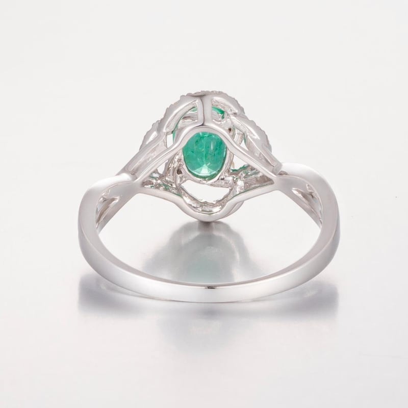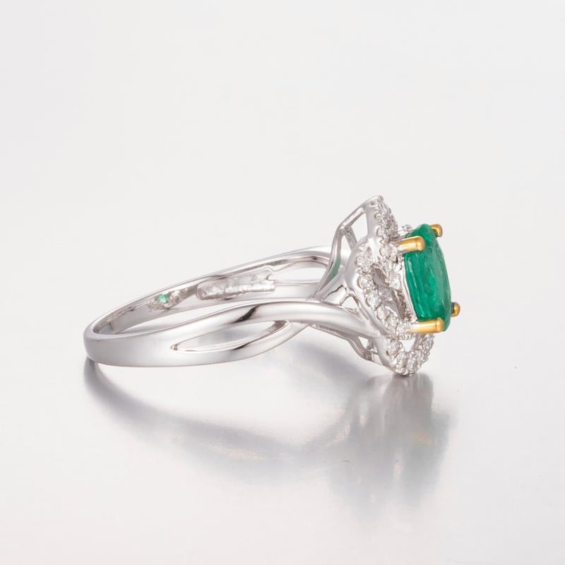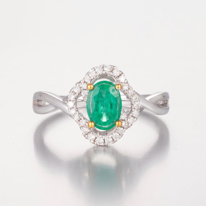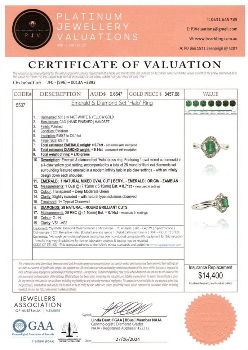 14CT WHITE GOLD ZAMBIAN EMERALD AND DIAMOND DRESS RING FEATURING CENTRE, OVAL CUT, DEEP MODERATE GREEN ZAMBIAN EMERALD (0.71CT, SLIGHTLY INCLUDED), CLAW SET IN YELLOW GOLD, WITH 28 ROUND BRILLIANT CUT DIAMONDS (0.14CT TDW, G-H COLOUR, VS1-VS2 CLARITY), PIP CLAW SET. RING SIZE O.
