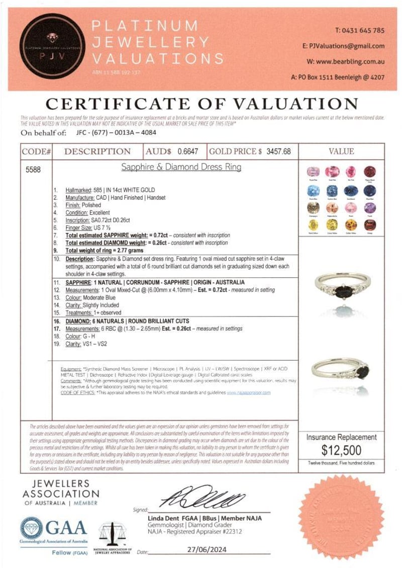 14CT WHITE GOLD AUSTRALIAN SAPPHIRE AND DIAMOND DRESS RING FEATURING CENTRE, ONE OVAL CUT, MODERATE BLUE AUSTRALIAN SAPPHIRES (0.72CT, SLIGHTLY INCLUDED), CLAW SET, WITH 6 ROUND BRILLIANT CUT DIAMONDS (0.26CT TDW, G-H COLOUR, VS1-VS2 CLARITY), CLAW SET. RING SIZE O. Valuations Provided by an Independent Third-Party Professional Not Directly Associated With Lloyds Auctions at AUD $12500This valuation has been conducted by an independent third-party professional. The valuation amount is an assessment by the issuing valuer and does not reflect the auction value of the item. Any inquiries regarding the valuation should be directed to the issuing valuer (refer to contact details on the certificate), as Lloyds Auctions has no affiliation or influence over the valuation, the valuer, or the stated amount. Condition: Good - Refer Images 0586211+1367