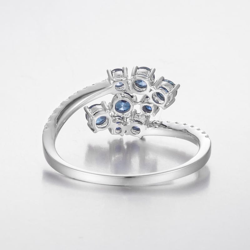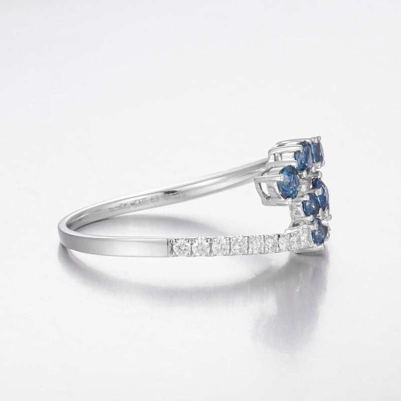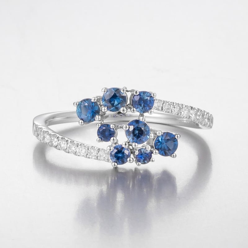 14CT WHITE GOLD AUSTRALIAN SAPPHIRE AND DIAMOND DRESS RING FEATURING, 8 ROUND CUT, MODERATE BLUE AUSTRALIAN SAPPHIRES (0.63CT TSW, SLIGHTLY INCLUDED), CLAW SET, WITH 18 ROUND BRILLIANT CUT DIAMONDS (0.19CT TDW, G-H COLOUR, VS1-VS2 CLARITY), PIP CLAW SET. RING SIZE O.