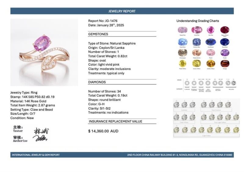 14CT ROSE GOLD PINK CEYLON SAPPHIRE AND DIAMOND DRESS RING FEATURING CENTRE, ONE OVAL CUT, LIGHT VIVID PINK CEYLON SAPPHIRE (0.82CT, MODERATE INCLUSIONS), CLAW SET, WITH 34 ROUND BRILLIANT CUT DIAMONDS (0.19CT TDW, G-H COLOUR, SI1-SI2 CLARITY), BEAD SET. RING SIZE O. Valuations Provided by an Independent Third-Party Professional Not Directly Associated With Lloyds Auctions at AUD $14360This valuation has been conducted by an independent third-party professional. The valuation amount is an assessment by the issuing valuer and does not reflect the auction value of the item. Any inquiries regarding the valuation should be directed to the issuing valuer (refer to contact details on the certificate), as Lloyds Auctions has no affiliation or influence over the valuation, the valuer, or the stated amount. Condition: Good - Refer Images 0586211+1362