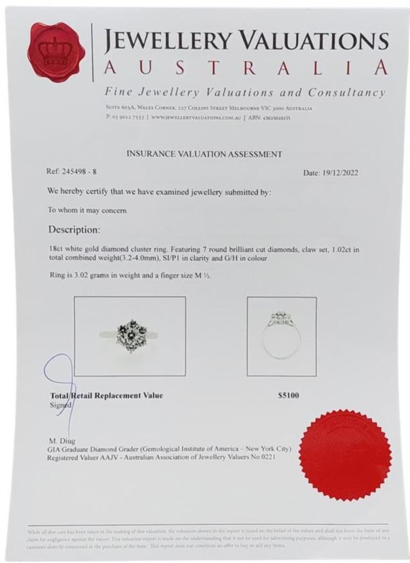 This Insurance Valuation has been provided by a registered Jewellery Valuer and is intended for insurance purposes only. The valuation amount has no bearing on the auction value of the item. Any questions regarding the valuation should be directed to the issuing Valuer (refer to contact details on the certificate) as Lloyds have no association or relationship with the Valuer or the valuation amount contained within the valuation.