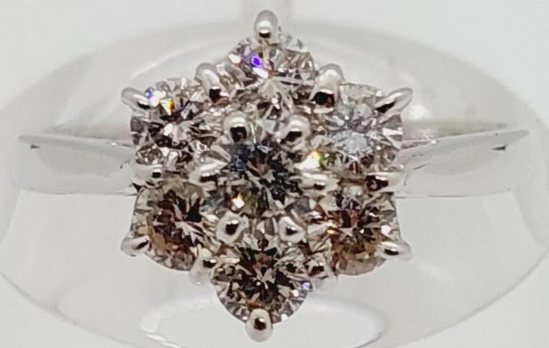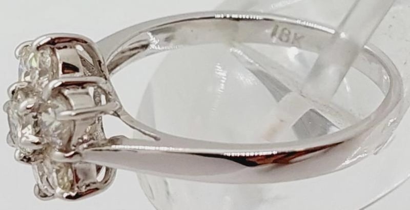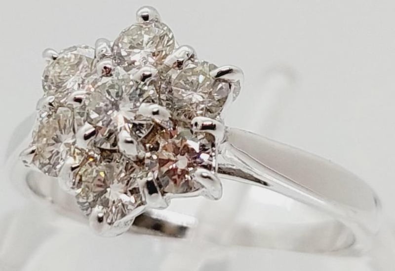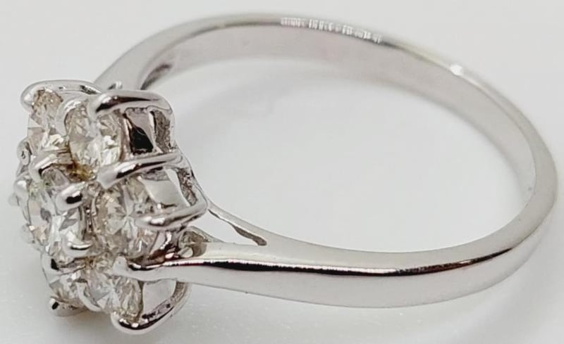 This 18 Carat White Gold Ring Features 7 Claw Set Round Brilliant Cut Diamonds, Tcw: 1.02, Clarity: Si-P1, Colour: G-H