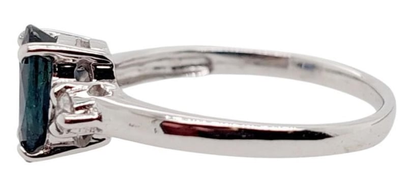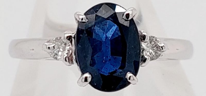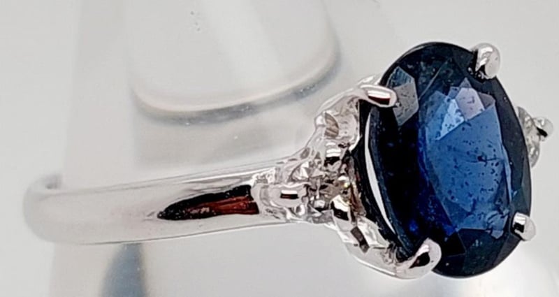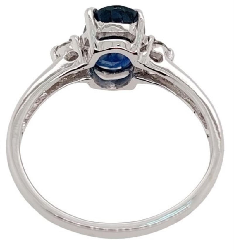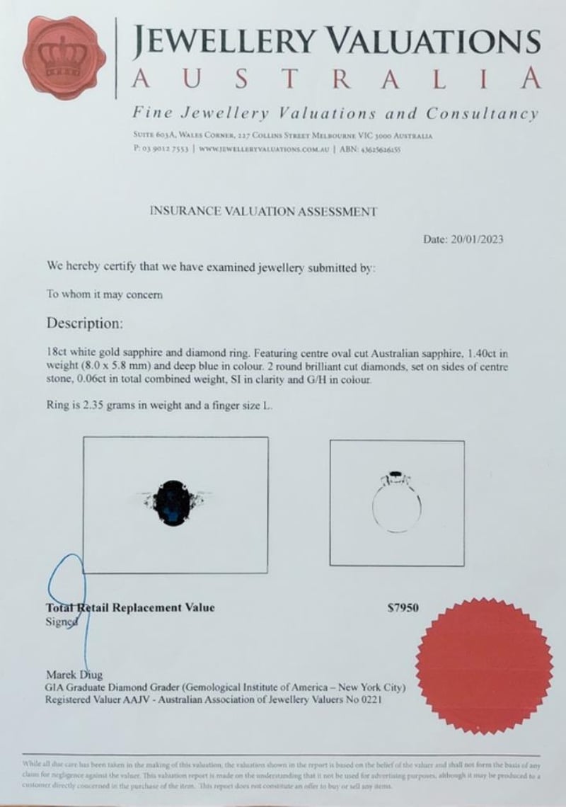 18CT WHITE GOLD SAPPHIRE AND DIAMOND RING Total Item Weight: 2.35gms This 18 Carat White Gold Ring Features One 1.40Ct Oval Cut Australian Sapphire Measuring 8.0Mm X 5.8Mm And Deep Blue In Colour With 2 Round Brilliant Cut Diamonds Set On The Side Of The Centre Stone, 0.06Ct In Total Combined Weight, Si In Clarity And G-H In Colour.Australian Ring Size: L Jewellery Valuations Provided By A Third Party Professional Not Directly Associated With Lloyds Auctions at AUD $7950This Insurance Valuation has been provided by a registered Jewellery Valuer and is intended for insurance purposes only. The valuation amount has no bearing on the auction value of the item. Any questions regarding the valuation should be directed to the issuing Valuer (refer to contact details on the certificate) as Lloyds have no association or relationship with the Valuer or the valuation amount contained within the valuation. Condition: Excellent- Refer Images 0162901+32CROSSDOCK