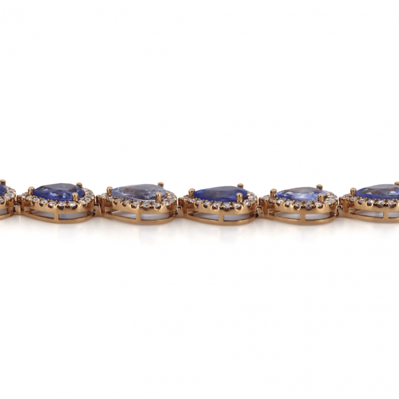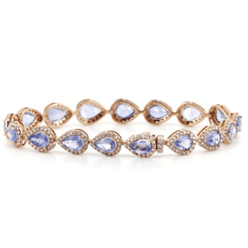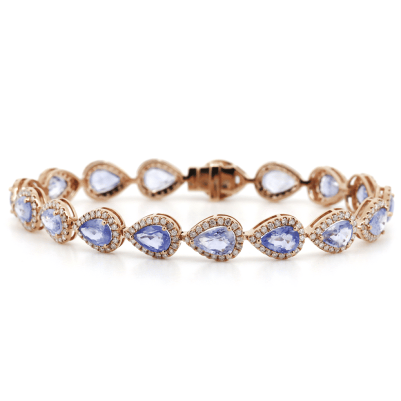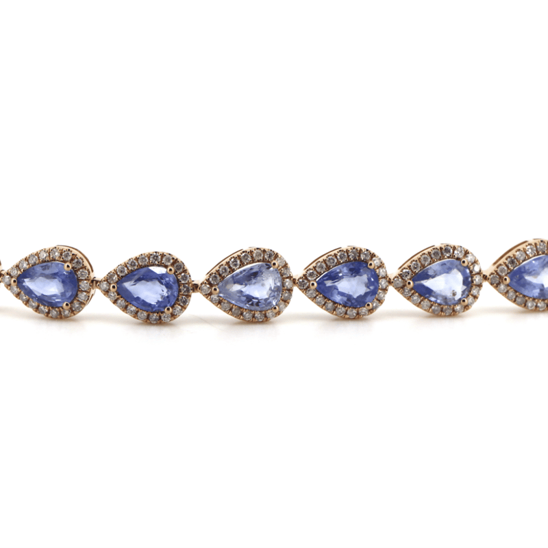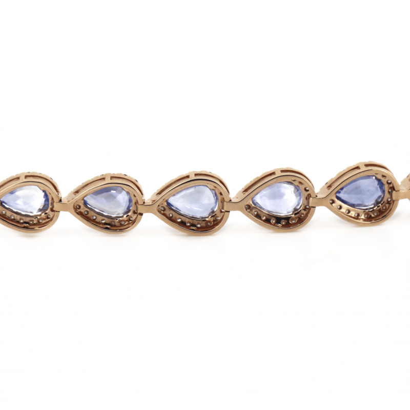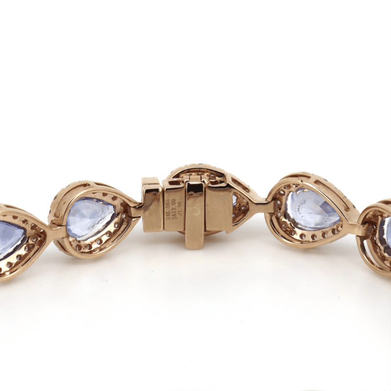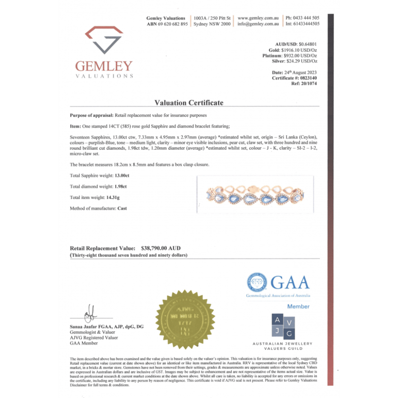 14K ROSE GOLD, 13.00CT TSW BLUE CEYLON SAPPHIRE AND DIAMOND, HALO BRACELET. THE DESIGN FEATURES, 17 PEAR CUT, MEDIUM LIGHT PURPLISH-BLUE, CEYLON SAPPHIRES (13.00CT TSW, MINOR EYE VISIBLE INCLUSIONS), CLAW SET. SURROUNDING THE CENTRES IN HALOS ARE, 309 ROUND BRILLIANT CUT, DIAMONDS (1.98CT TDW, J-K COLOUR, SI2-I2 CLARITY), MICRO-CLAW SET. THE BRACELET HAS BOX LOCK CLOSURE WITH A HINGED SAFETY CATCH. BRACELET LENGTH IS 18.2CM. Valuations Provided by an Independent Third-Party Professional Not Directly Associated With Lloyds Auctions at AUD $$38,790.00This valuation has been conducted by an independent third-party professional. The valuation amount is an assessment by the issuing valuer and does not reflect the auction value of the item. Any inquiries regarding the valuation should be directed to the issuing valuer (refer to contact details on the certificate), as Lloyds Auctions has no affiliation or influence over the valuation, the valuer, or the stated amount. Condition: Good - Refer Images 0645873+153