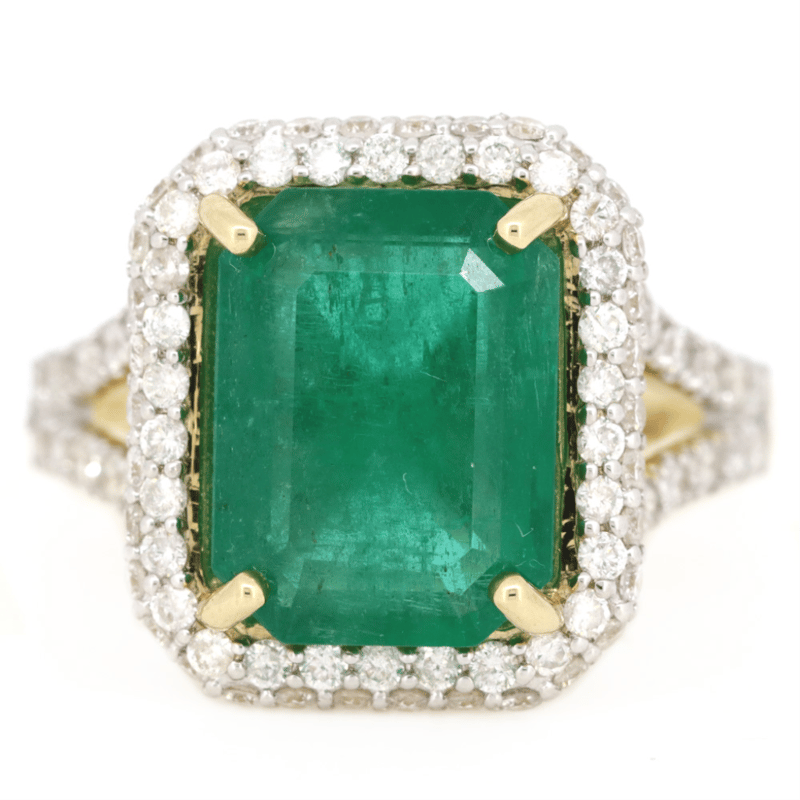 14K YELLOW/WHITE GOLD, EMERALD AND DIAMOND, HALO SPLIT BAND RING. THE DESIGN FEATURES, ONE EMERALD CUT, MEDIUM BLUISH-GREEN, EMERALD (4.36CT, MODERATE EYE VISIBLE INCLUSIONS), 4 CLAW SET. SURROUNDING THE DESIGN IN HALO AND DECORATING THE BAND ARE, 88 ROUND BRILLIANT CUT, DIAMONDS (0.87CT TDW, J-K COLOUR, SI2-I2 CLARITY), BEAD SET IN WHITE GOLD. RING SIZE M.