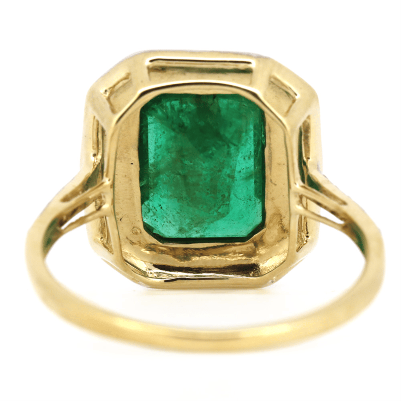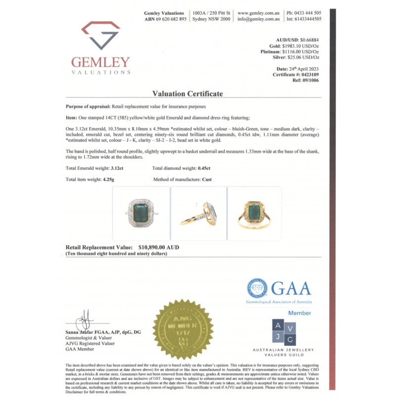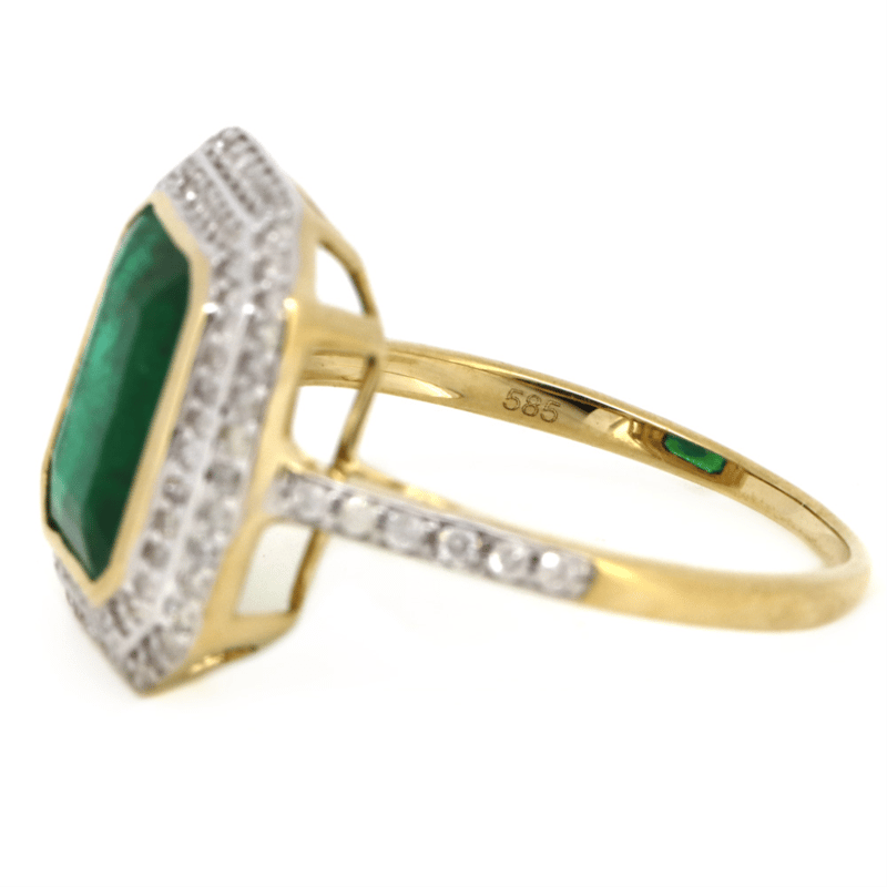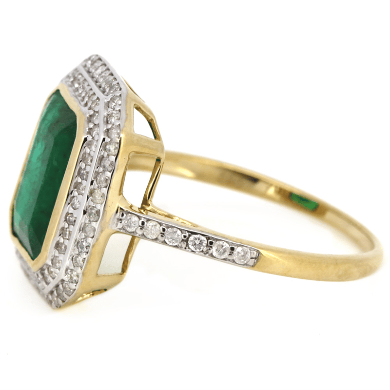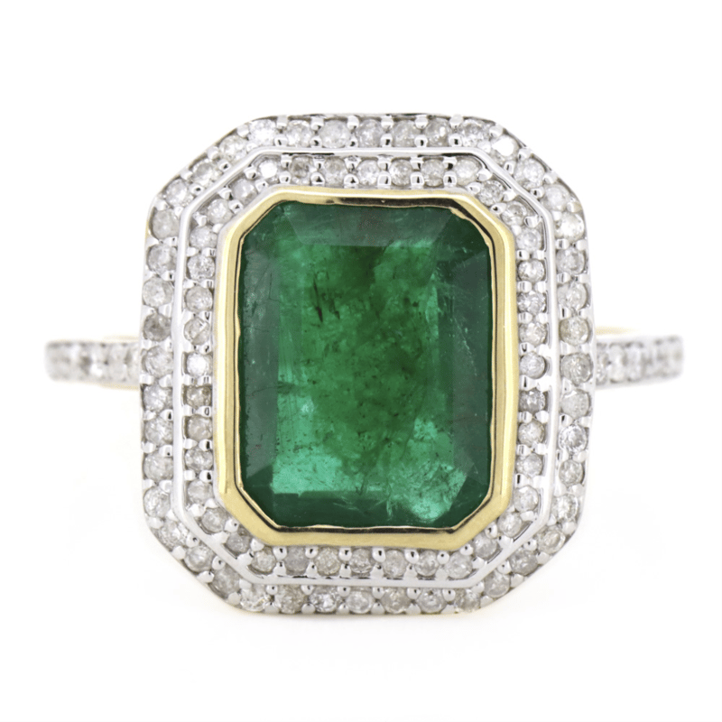 14K YELLOW GOLD, EMERALD AND DIAMOND, DOUBLE HALO RING. THE CENTRE FEATURES, ONE EMERALD CUT, MEDIUM-DARK BLUISH-GREEN, EMERALD (3.12CT, INCLUDED), BEZEL SET. SURROUNDING THE CENTRE IN A DOUBLE HALO AND DECORATING THE BAND ARE, 96 ROUND BRILLIANT CUT, DIAMONDS (0.45CT TDW, J-K COLOUR, SI2-I2 CLARITY), BEAD SET IN WHITE GOLD. RING SIZE Q 1/2.