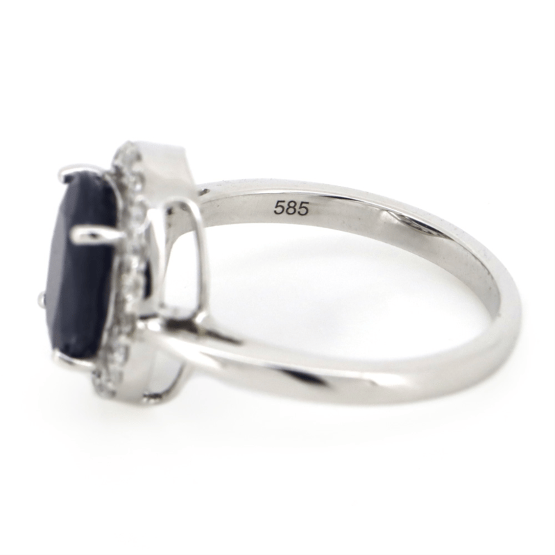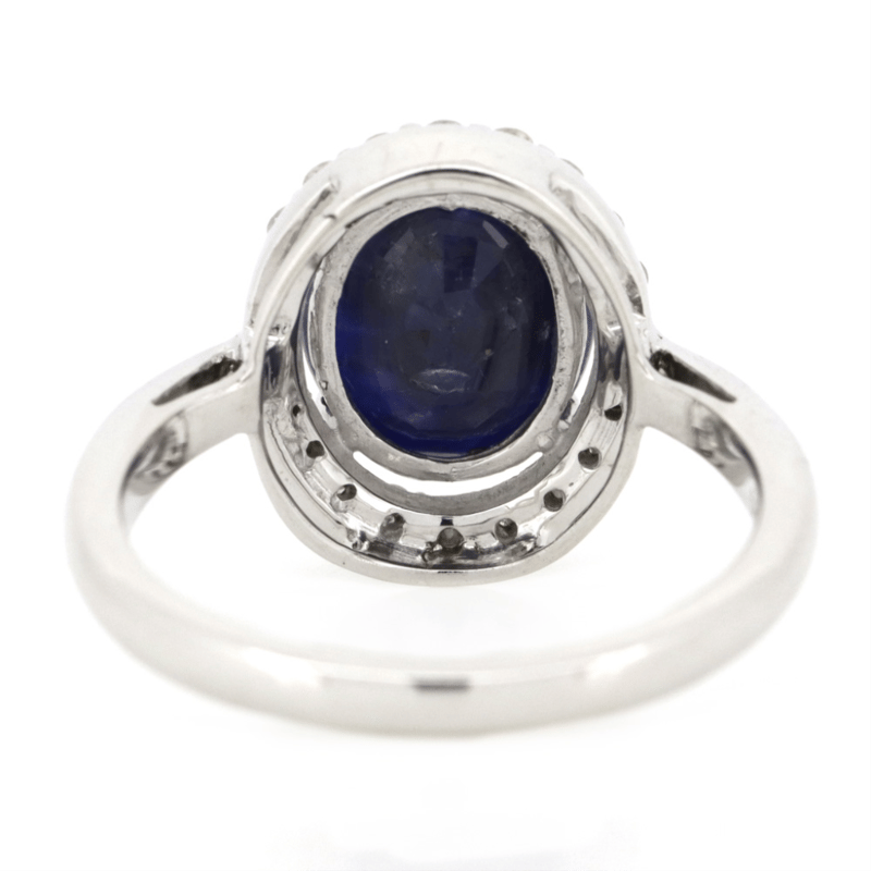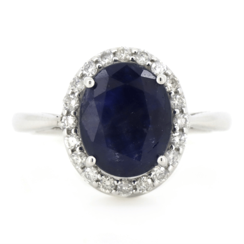 14K WHITE GOLD, BLUE SAPPHIRE AND DIAMOND, HALO RING. THE CENTRE FEATURES, ONE OVAL CUT, DEEP MODERATE ROYAL BLUE, SAPPHIRE (3.30CT, MODERATELY INCLUDED), 4 CLAW BASKET SET. SURROUNDING THE CENTRE IN A HALO ARE, 20 ROUND BRILLIANT CUT, DIAMONDS (0.28CT TDW, G-H COLOUR, SI1-SI2), BEAD SET. RING SIZE L 1/2.