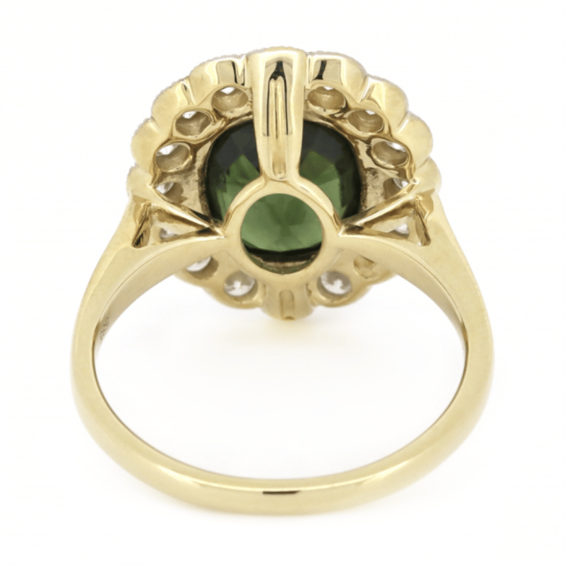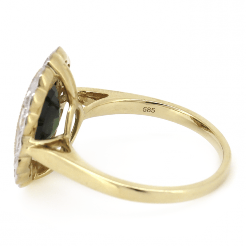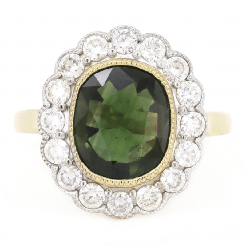 14K YELLOW GOLD, GREEN SAPPHIRE AND DIAMOND, HALO RING. THE CENTRE FEATURES, ONE OVAL CUT, MEDIUM DARK BLUISH-GREEN, SAPPHIRE (3.74CT, MINOR EYE VISIBLE INCLUSIONS), BEZEL SET WITH MILLEGRAIN DETAIL. SURROUNDING THE CENTRE IN A HALO ARE, 16 ROUND BRILLIANT CUT, DIAMONDS (0.89CT TDW, J-K COLOUR, SI2-I2 CLARITY), SEMI-BEZEL/BEAD SET IN WHITE GOLD WITH MILLEGRAIN DETAIL. RING SIZE O 1/2. Valuations Provided by an Independent Third-Party Professional Not Directly Associated With Lloyds Auctions at AUD $$12,790.00This valuation has been conducted by an independent third-party professional. The valuation amount is an assessment by the issuing valuer and does not reflect the auction value of the item. Any inquiries regarding the valuation should be directed to the issuing valuer (refer to contact details on the certificate), as Lloyds Auctions has no affiliation or influence over the valuation, the valuer, or the stated amount. Condition: Good - Refer Images 0645873+198