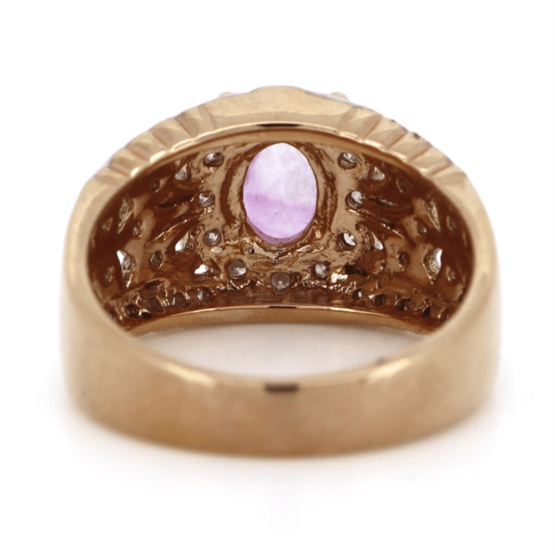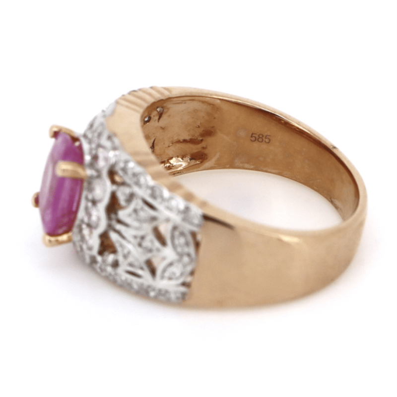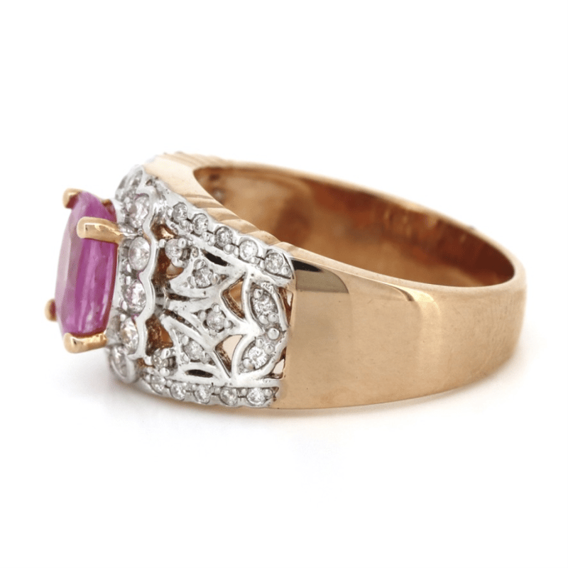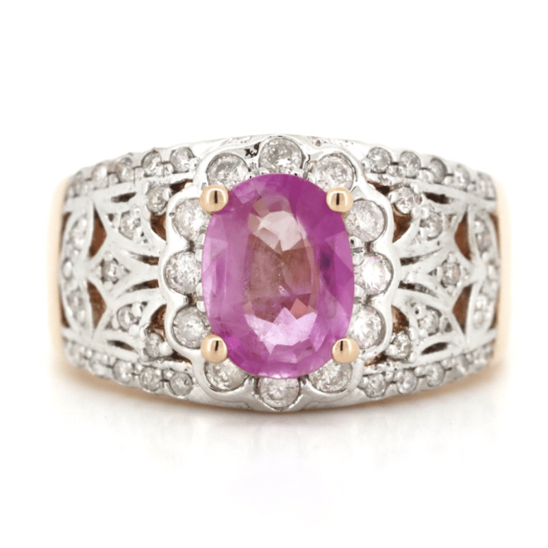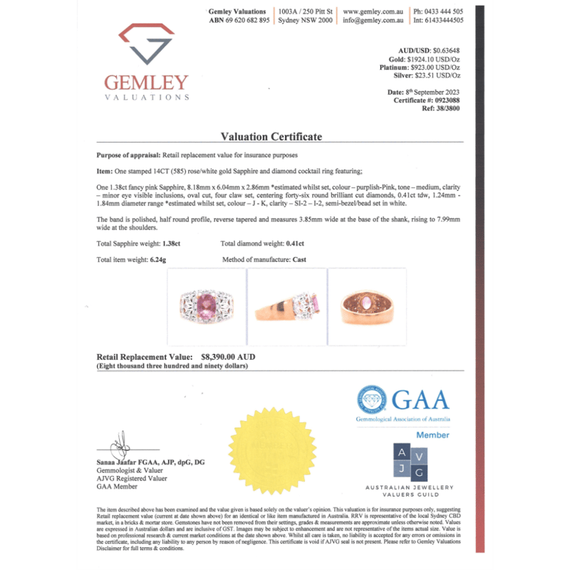 14K ROSE/WHITE GOLD, PINK SAPPHIRE AND DIAMOND, DRESS RING. THE CENTRE FEATURES, ONE OVAL CUT, PINK SAPPHIRE (1.38CT, MINOR EYE VISIBLE INCLUSIONS), 4 CLAW SET. ENCOMPASSING THE CENTRE ARE, 46 ROUND BRILLIANT CUT, DIAMONDS (0.41CT TDW, J-K COLOUR, SI2-I2 CLARITY), SEMI BEZEL-BEAD SET. RING SIZE M. Valuations Provided by an Independent Third-Party Professional Not Directly Associated With Lloyds Auctions at AUD $$8,390.00This valuation has been conducted by an independent third-party professional. The valuation amount is an assessment by the issuing valuer and does not reflect the auction value of the item. Any inquiries regarding the valuation should be directed to the issuing valuer (refer to contact details on the certificate), as Lloyds Auctions has no affiliation or influence over the valuation, the valuer, or the stated amount. Condition: Good - Refer Images 0645873+111