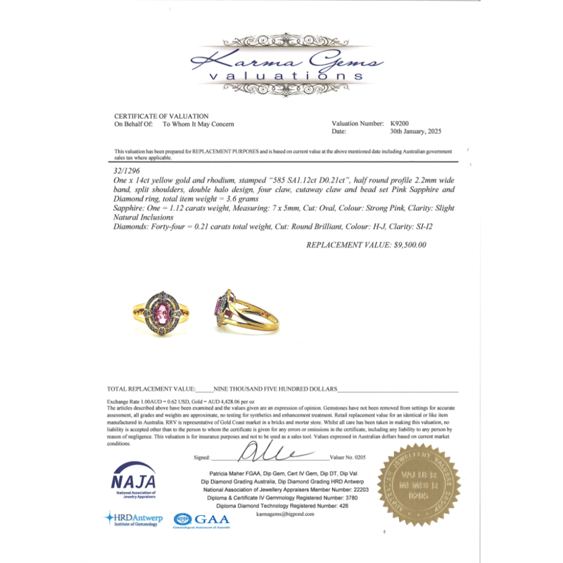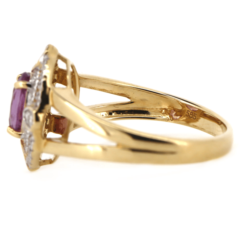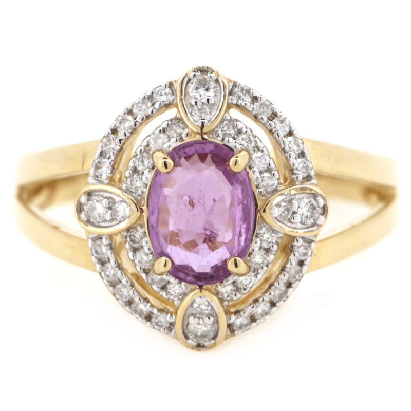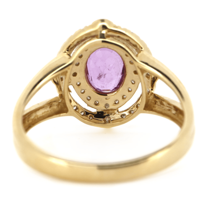 14K YELLOW GOLD, PINK SAPPHIRE AND DIAMOND, DOUBLE HALO RING. THE CENTRE DESIGN FEATURES, ONE OVAL FACETED CUT, PINK SAPPHIRE (1.12CT TSW, TONE MEDIUM-DEEP COLOUR, SLIGHTLY INCLUDED CLARITY), 4 CLAW SET. ENCOMPASSING THE DESIGN ARE, 44 ROUND BRILLIANT CUT, DIAMONDS (0.21CT TDW, H-J COLOUR, SI-S2 CLARITY), MICRO-BEAD SET.