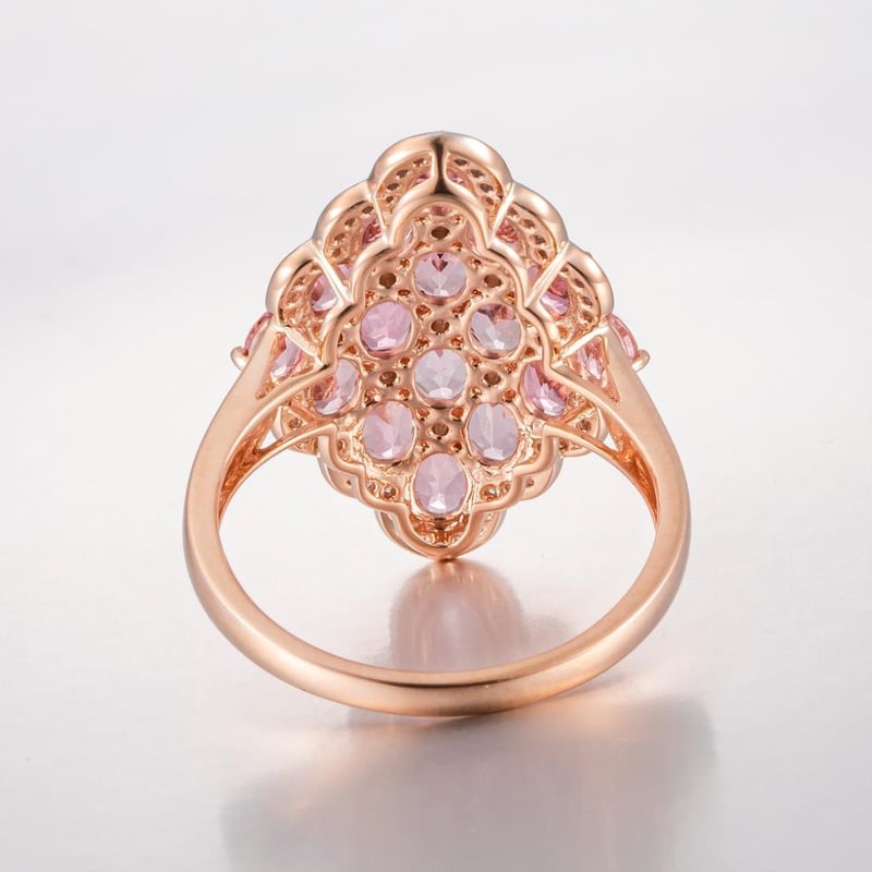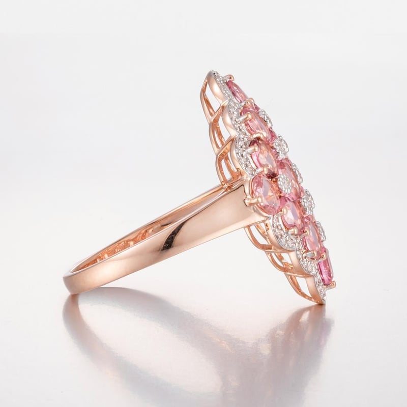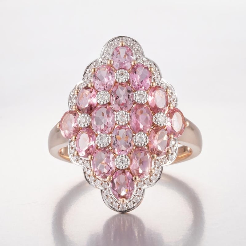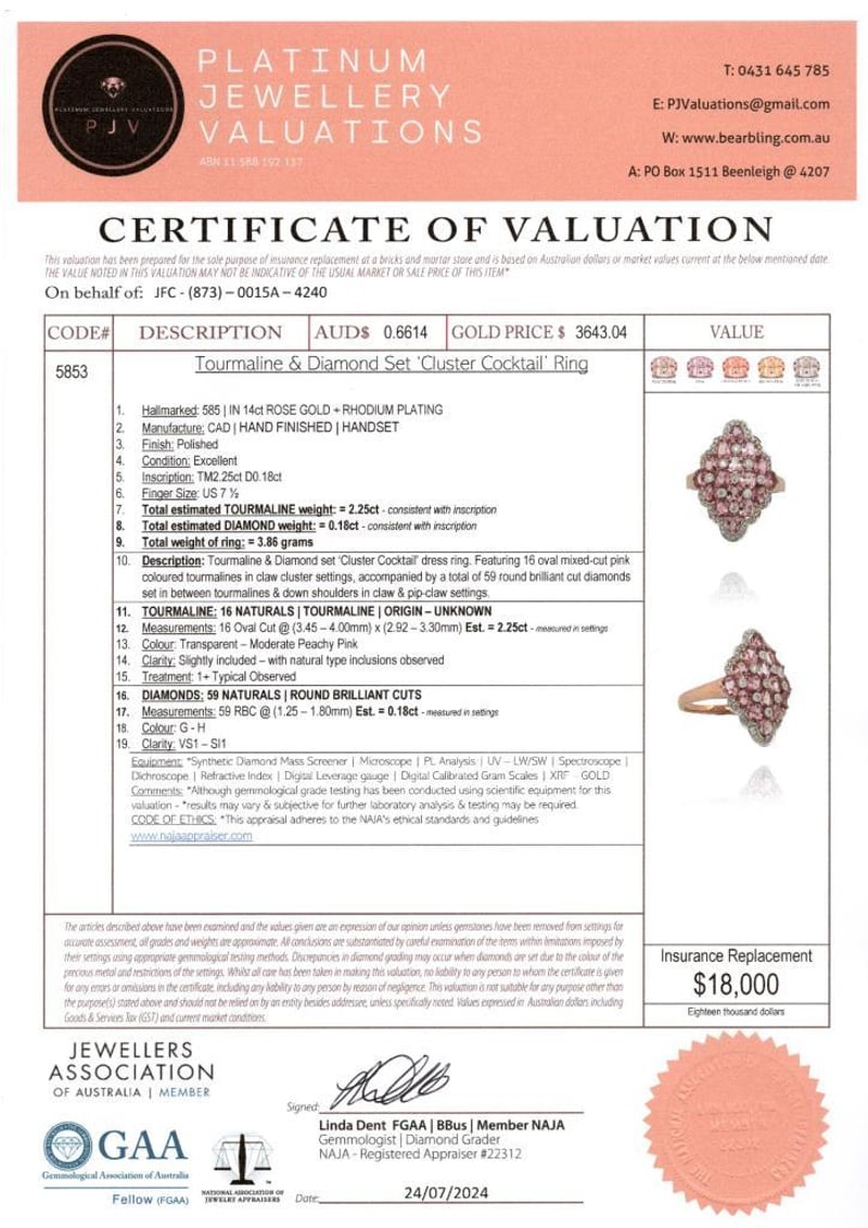 14CT ROSE GOLD TOURMALINE AND DIAMOND CLUSTER RING 14Ct Rose Gold Tourmaline And Diamond Cluster Ring Featuring Centre, 16 Oval Cut, Moderate Peachy-Pink Tourmalines (2.25Ct Tsw, Slightly Included), Bead Set, With 59 Round Brilliant Cut Diamonds (0.18Ct Tdw, G-H Colour, Vs1-Si1 Clarity), Claw Set. Ring Size O. Valuations Provided by an Independent Third-Party Professional Not Directly Associated With Lloyds Auctions at AUD $18000This valuation has been conducted by an independent third-party professional. The valuation amount is an assessment by the issuing valuer and does not reflect the auction value of the item. Any inquiries regarding the valuation should be directed to the issuing valuer (refer to contact details on the certificate), as Lloyds Auctions has no affiliation or influence over the valuation, the valuer, or the stated amount. Condition: Good - Refer Images 0586222+1386