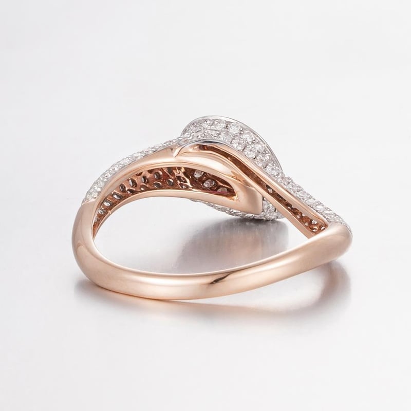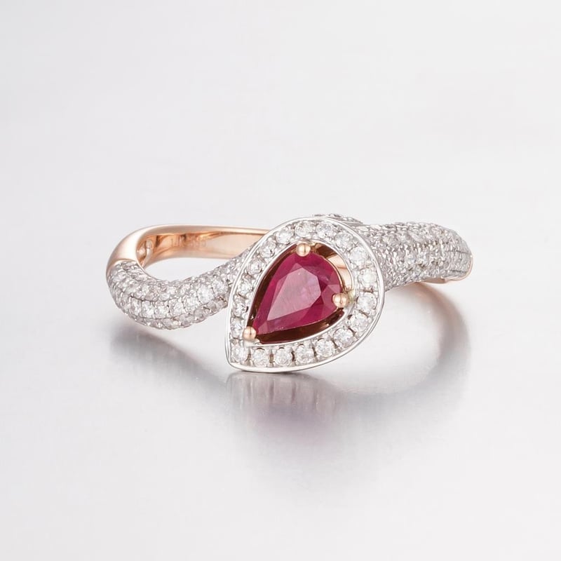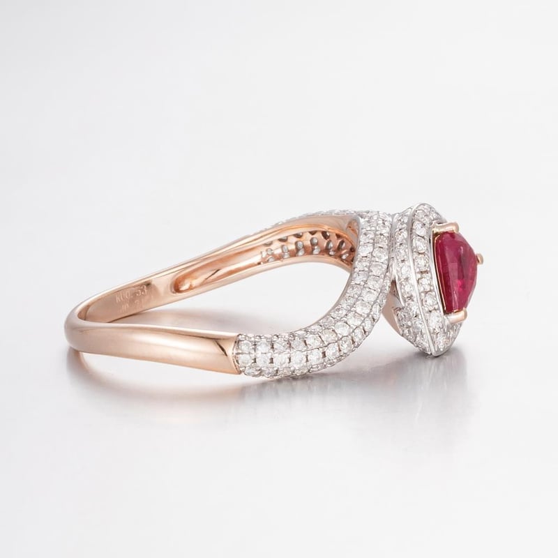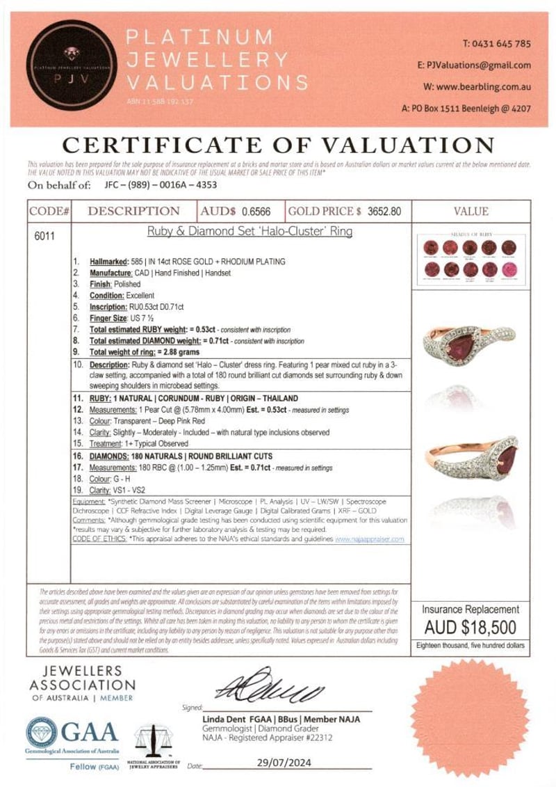 14Ct Rose Gold Ruby And Diamond Dress Ring Featuring Centre, One Pear Cut, Deep Pink Red Ruby (0.53Ct Slightly-Moderate Inclusions), Claw Set, With 180 Round Brilliant Cut Diamonds (0.71Ct Tdw, G-H Colour, Vs1-Vs2 Clarity), Micro Bead Set In White Gold. Ring Size O.