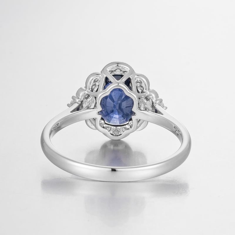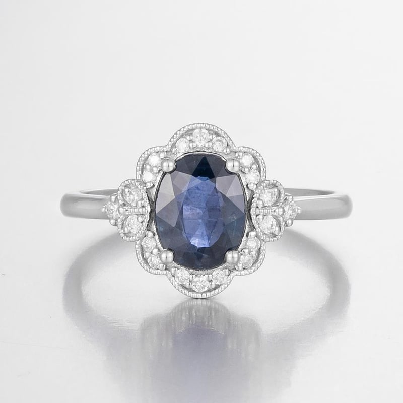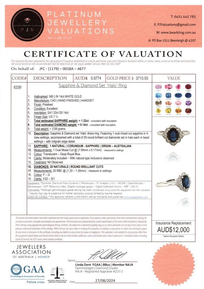14Ct White Gold Australian Sapphire And Diamond Halo Ring Featuring Centre, One Oval Cut, Deep Royal Blue Australian Sapphire (1.32Ct, Moderately Included), Claw Set, With 20 Round Brilliant Cut Diamonds (0.14Ct Tdw, F-G Colour, Vs2-Si1 Clarity), Bead Set. Ring Size O.