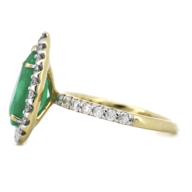 14K YELLOW GOLD, 2.37CT COLOMBIAN EMERALD AND DIAMOND, HALO RING. THE DESIGN FEATURES, ONE PEAR CUT, MEDIUM BLUISH-GREEN, COLOMBIAN EMERALD (2.37CT, MODERATE EYE VISIBLE INCLUSIONS), PRONG/CLAW SET. SURROUNDING THE CENTRE IN A HALO AND DECORATING THE BAND ARE, 34 ROUND BRILLIANT CUT, DIAMONDS (0.68CT TDW, J-K COLOUR, SI2-I2 CLARITY), MICRO-CLAW SET IN WHITE GOLD. RING SIZE L 1/2.